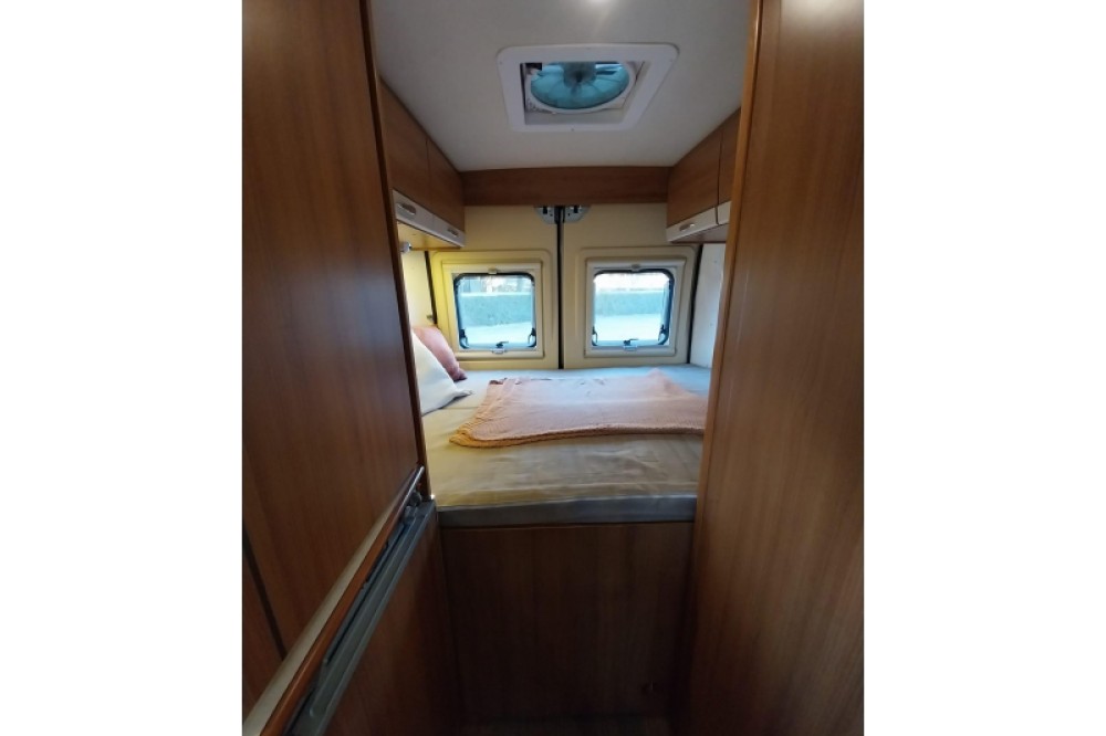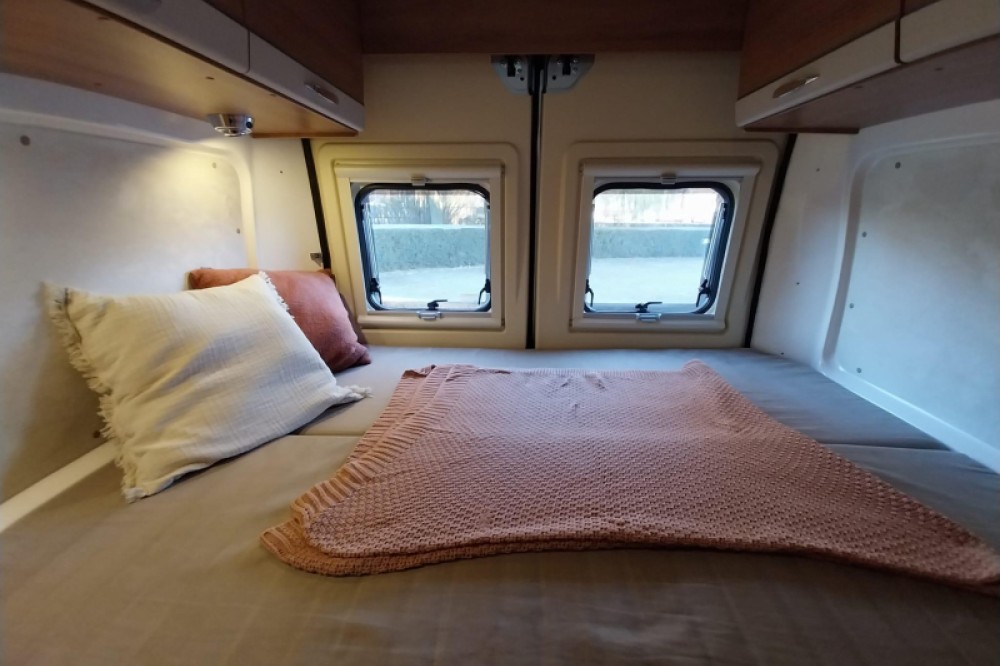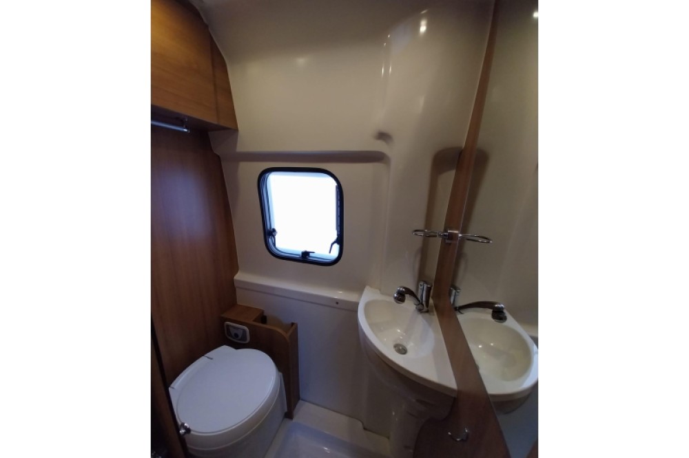 Dankzij de traagschuimmatrassen en lattenbodems kunt u genieten van extra comfortabele bedden. De badkamer biedt wasgelegenheid in de vorm van een wastafel. Tevens is er een ingebouwde cassettetoilet aanwezig. Naast het slaapgedeelte bevindt zich ook de douchegelegenheid. Achterin de camper bevind zich het ruime twee persoonsdwarsbed. Dit bed heeft een lengte van 190 cm en is 130 cm breed.