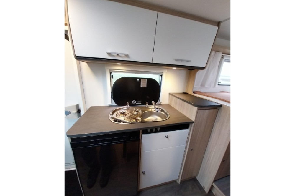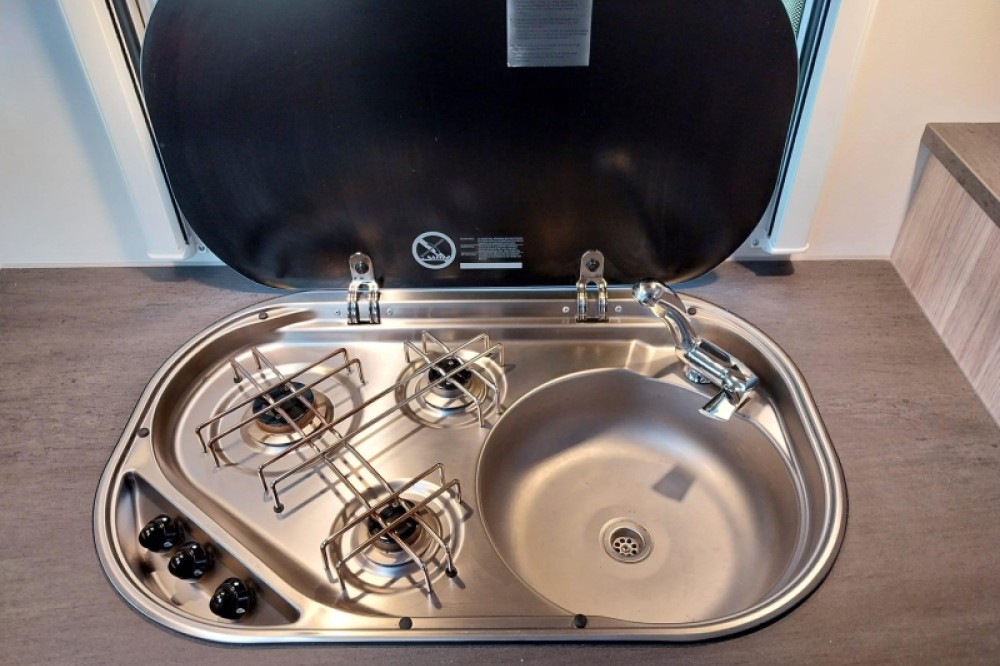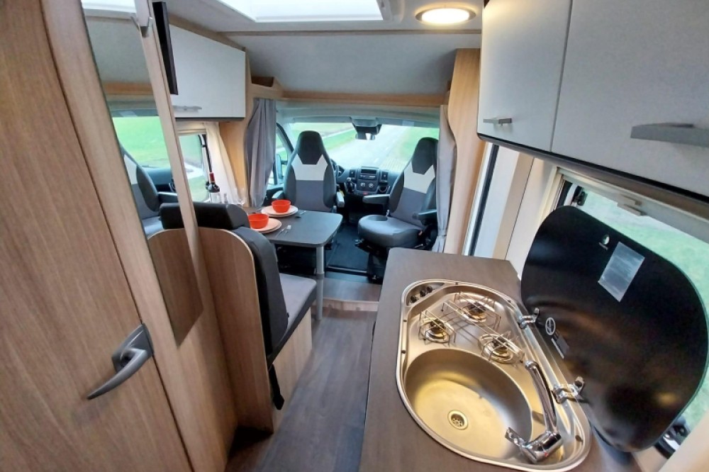 De keuken is in het midden van de camper geplaatst en beschikt over een 3-pits kooktoestel en gootsteen met kraan. Voor een snelle toevoer van warm water is er een boiler aanwezig. Om uw etenswaren op te bergen is er een koelkast met vriescompartiment ingebouwd. Naast de ruime treinzit waar vele gezellige avonden doorgebracht kunnen worden. Kan deze treinzit zelfs als extra slaapplek gebruikt worden. Ideaal voor uw (klein) kind. Dit bed heeft een lengte van 110 cm en is 100 cm breed.