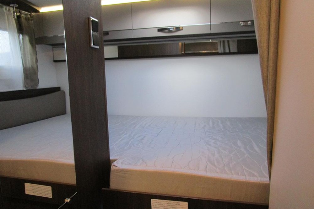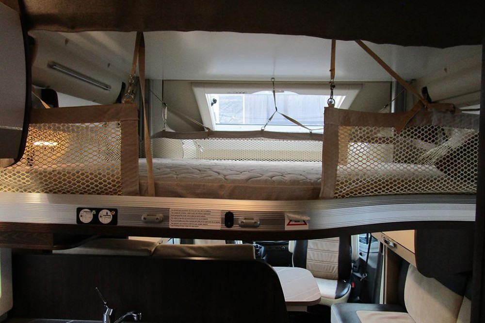 Aanwezige bedden: Groot bed in hoogte verstelbaar: 130 x 210 cm / hefbed elektrisch bediend: 140 x 200 cm / dinette ombouwbed: 100 x 200 cm.