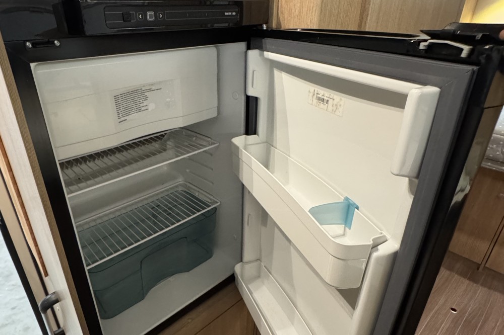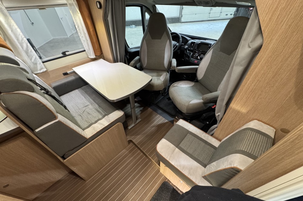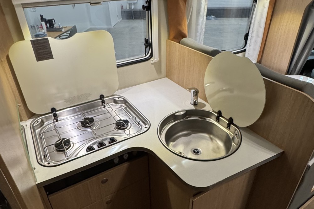 De uitnodigende L-zit is een prima plek om gezellig te eten en te drinken. Centraal in de camper bevindt zich de middenkeuken, uitgerust met een spoelbak, kraan en 3-pits kooktoestel. Er is een warmwatervoorziening in de vorm van een 10 liter boiler aanwezig. De koelkast met vriesvak biedt voldoende ruimte voor heel uw voorraad.