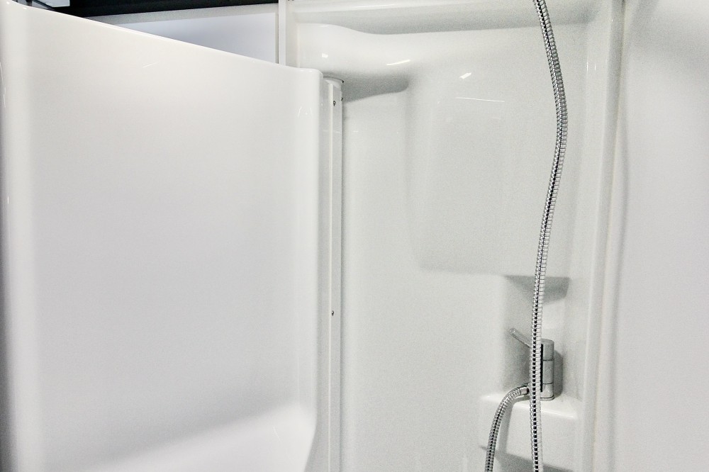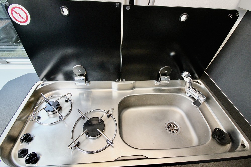 Achterin 2 lengtebedden, de badkamer met een draaibaar toilet, wastafel en een aparte douche, De keuken is voorzien van een 2-pits gaskomfoor,RVS spoelunit en een grote koelkast met vriesvak, een 4-persoons dinette met 2 comfortabele lederen draaistoelen
