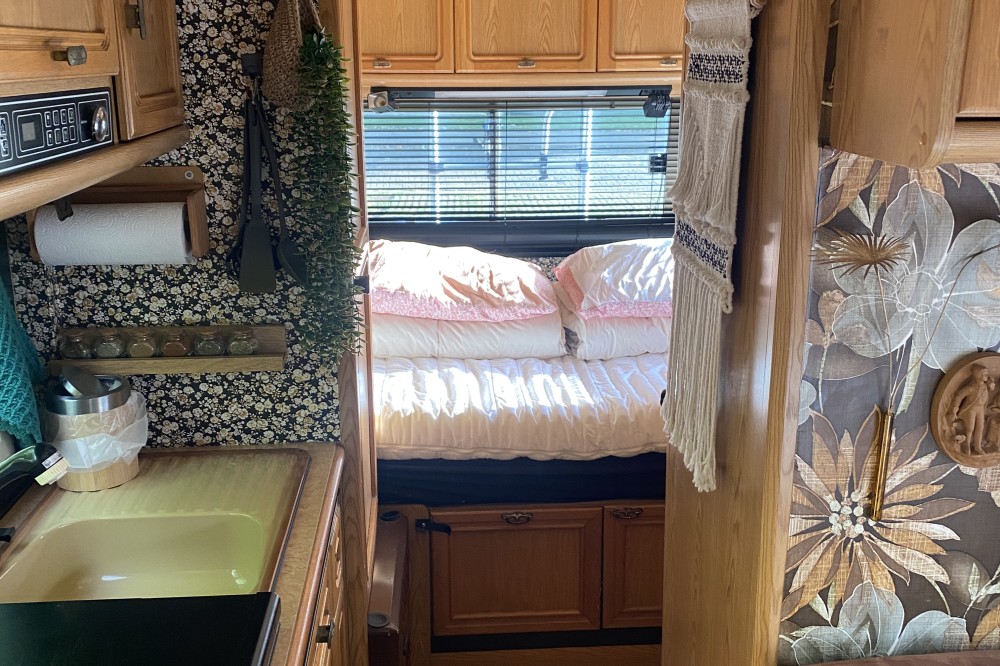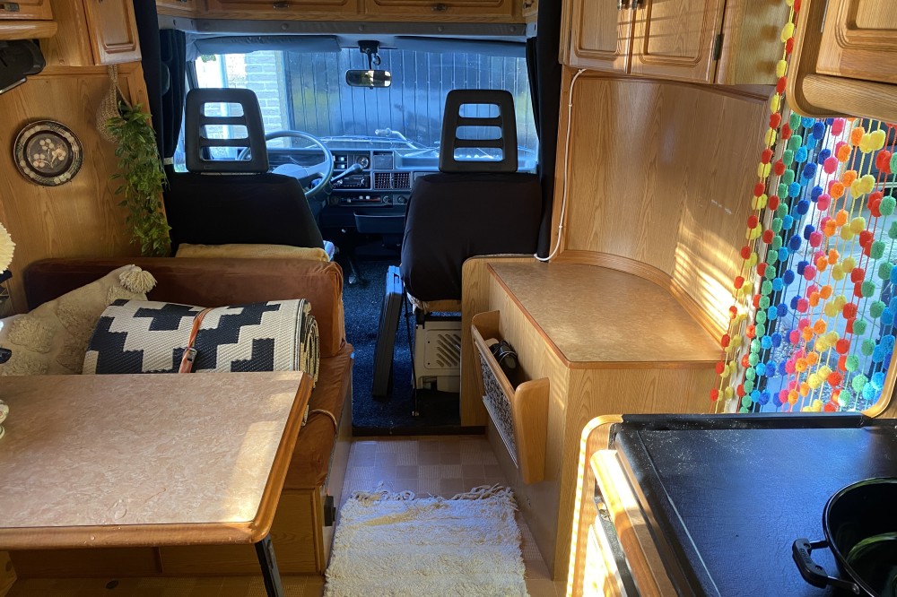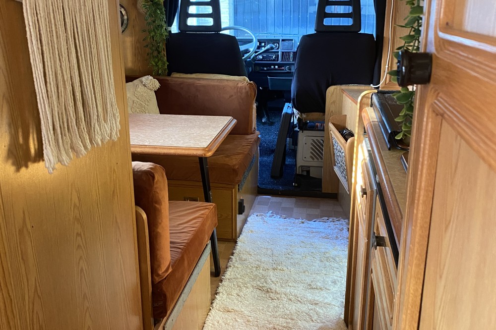 Het complete interieur is de afgelopen jaren aangepakt en voorzien van een warme vintage uitstraling. Door de ruime stahoogte en de vele ramen is de camper licht, open en gezellig van binnen. Een fijne plek om ook bij minder weer comfortabel binnen te zitten.