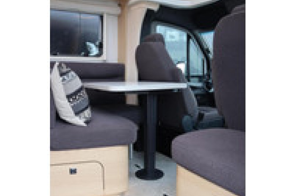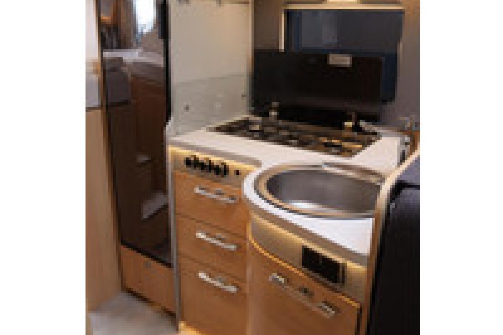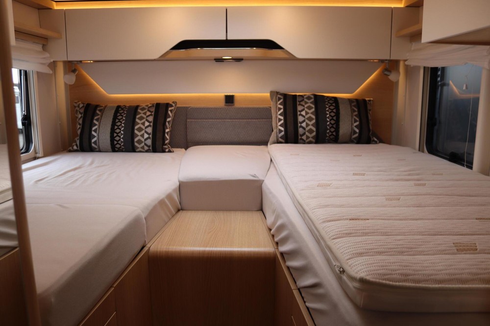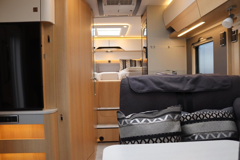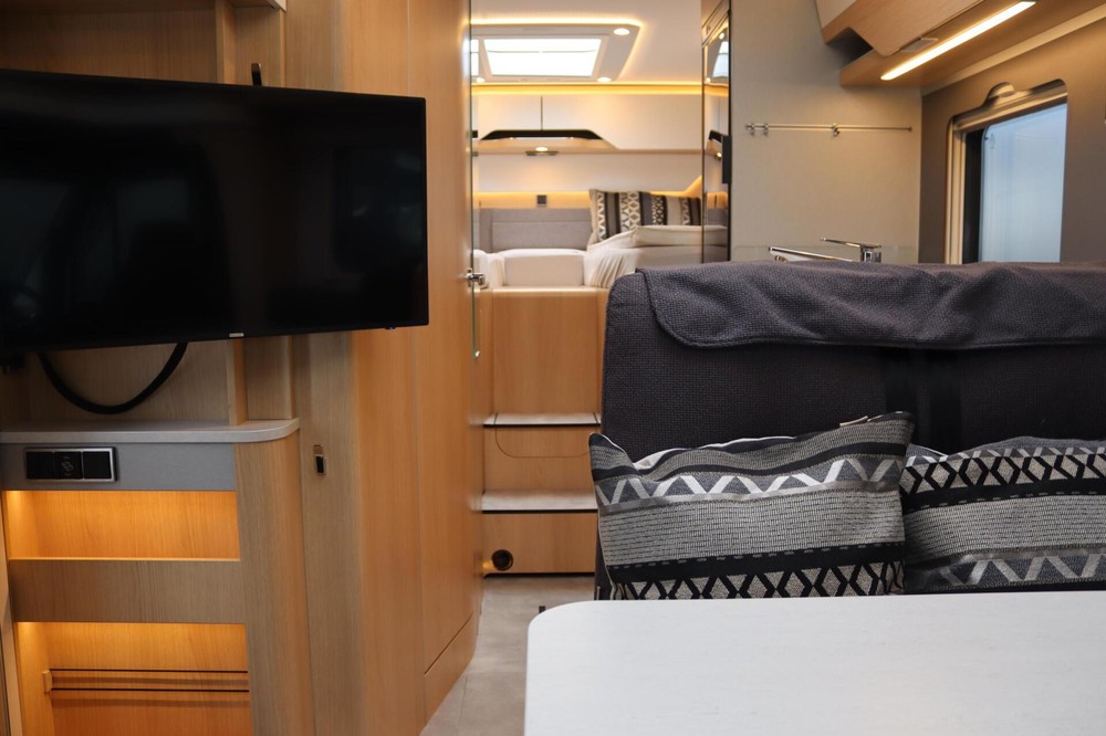 Luxe en praktische detailsDe Hymer BMC-T 600 biedt een ruime zithoek met een L-zit die ontstaat door de draaibare voorstoelen. Het elegante Grand Oak meubeldecor in combinatie met de luxe Bogota bekleding zorgt voor een verfijnde uitstraling. Dankzij de dubbele bodem, die verwarmd is en extra opbergruimte biedt, kun je jouw spullen veilig en droog opbergen. De 180 liter schoonwatertank en de 150 liter vuilwatertank zijn weggewerkt in de dubbele bodem, terwijl je vanuit de buitenkant eenvoudig toegang hebt tot de opslagruimte. De ruime garage heeft een laadhoogte van 132 cm, is aan beide zijden toegankelijk en biedt voldoende ruimte voor uw fietsen, scooter en bagage.