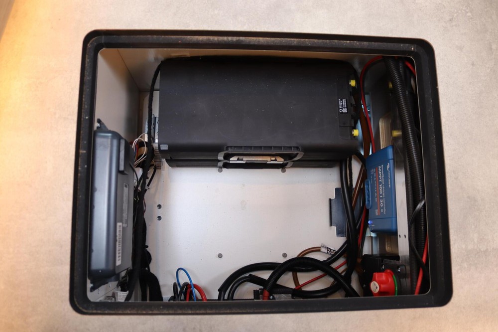 De garage is volledig bekleed, er liggen twee grote zonnepanelen op het dak en met 160Ah aan lithium en een omvormer kun je moeiteloos off-grid staan.