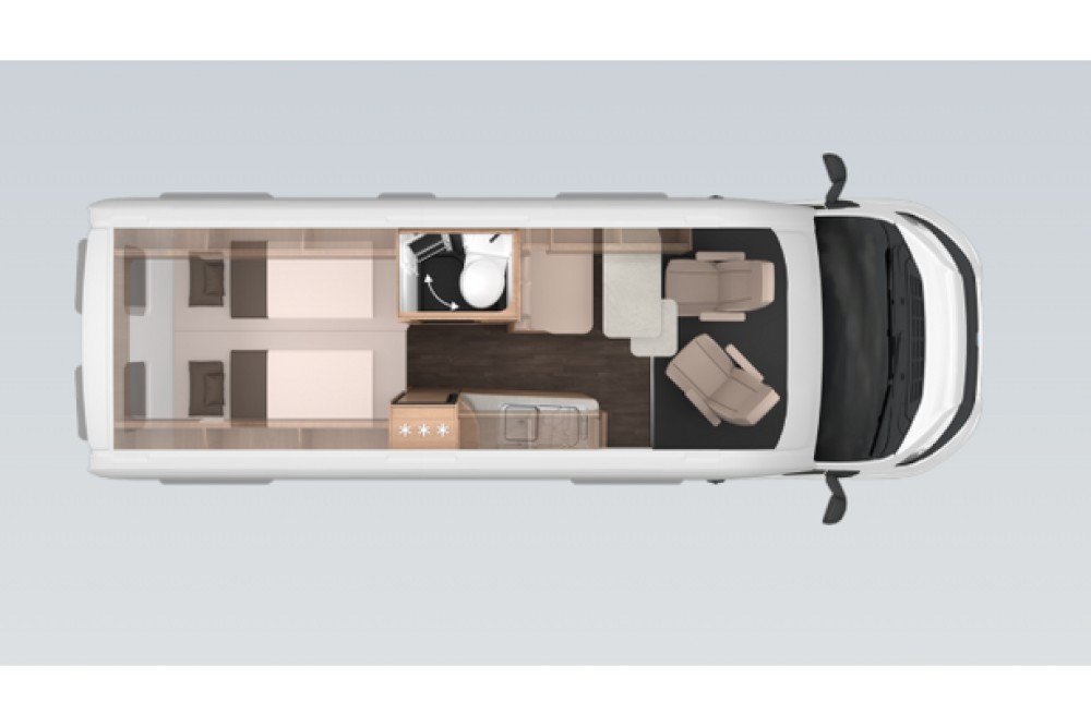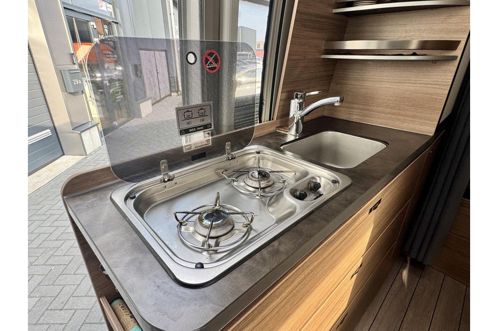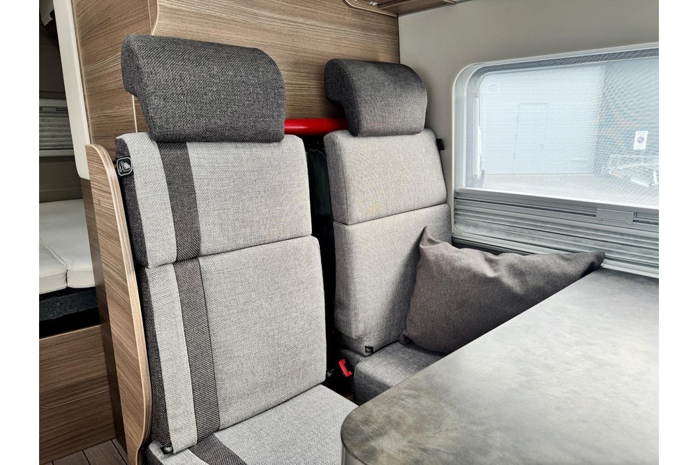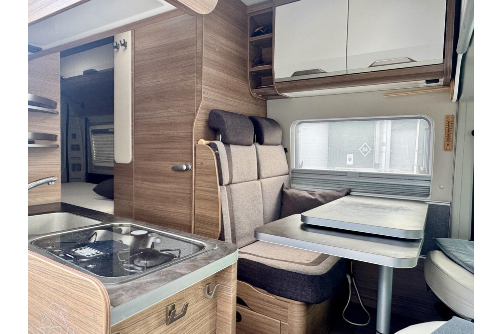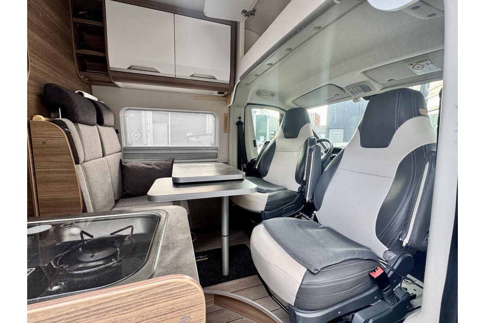 Het woongedeelte voelt ruim en gezellig aan dankzij de kopzit met draaibare voorstoelen, waardoor je eenvoudig een comfortabele zithoek creëert. In combinatie met de standaardzit ontstaat er een fijne leefruimte waar je kunt ontspannen, eten of plannen maken voor de volgende bestemming.