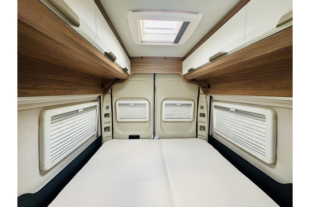 Dankzij de grote dakluiken valt er veel natuurlijk licht naar binnen. Voor de nachtrust is er een ruim tweepersoons hefbed (ca. 188 x 184 cm) met lattenbodem en matras, waardoor je elke nacht comfortabel slaapt. De cabine is voorzien van verduistering rondom, die jouw nacht ongestoord maken.