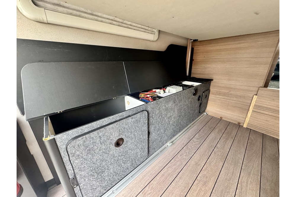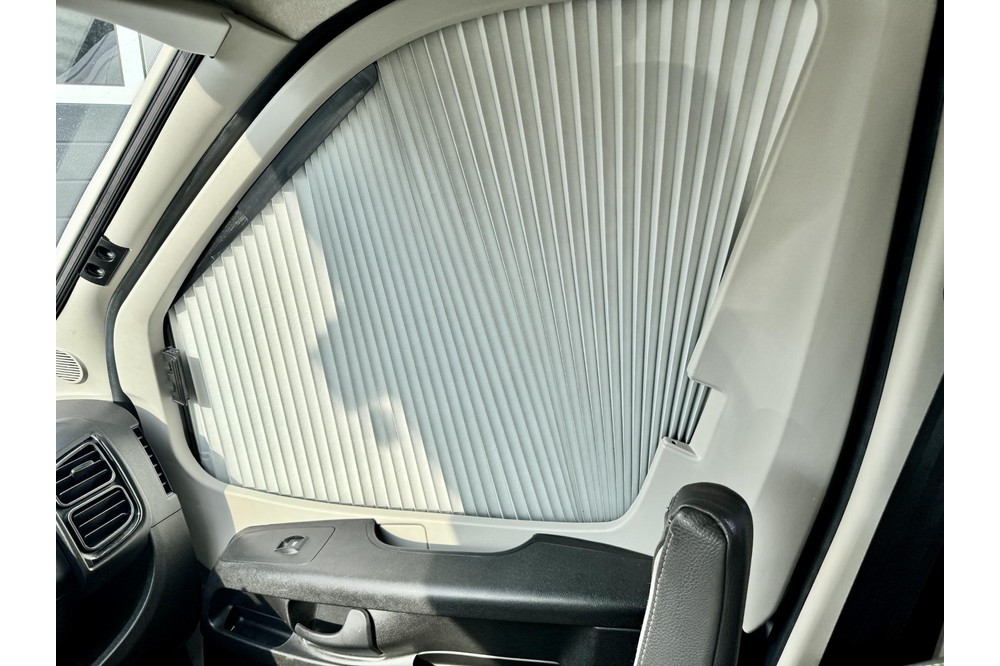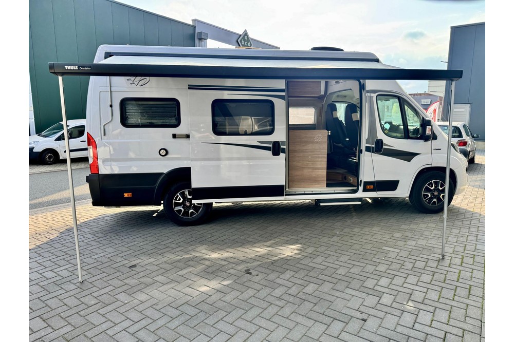 Aan de buitenzijde maakt de camper een verzorgde en moderne indruk met LED-dagrijverlichting en lichtmetalen velgen. De grote Thule Omnistor luifel (400 x 250 cm) in antraciet, compleet met zijflap en stabilisatiestangen, creëert in een handomdraai een comfortabele buitenruimte. De elektrische opstap maakt instappen eenvoudig.