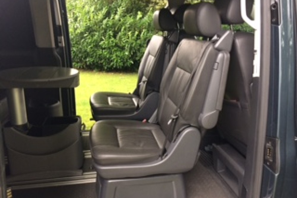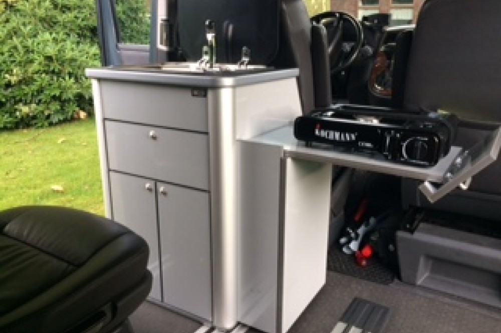 twee elektrische zijdeuren met schuiframen, ombouw is van het merk Reimo, de motor is geüpgraded van 174 pk naar 204, in nov. 2025 is de camper voorzien van een nieuwe nokkenas c.s., afneembare trekhaak, nieuwe brede banden 255/55/17 op lm-velgen, notenhouten dashboard, leren bekleding waarvan 4 stoelen met ieder 2 verstelbare armleuningen, stoel op de 2 rij draaibaar, volkswagen uitklaptafel (tevens in hoogte verstelbaar) op rails, sterke 5 cylinder motor, 2500 cc, 2e set lm-wielen, raamblinderingen, mobiel keukenblokje, onderhoud bij VW-dealer, bed met lattenbodem (weinig gebruikt)