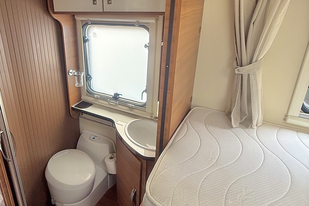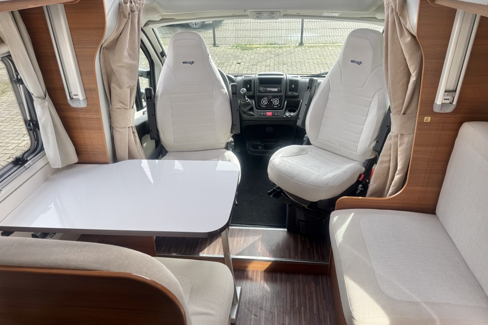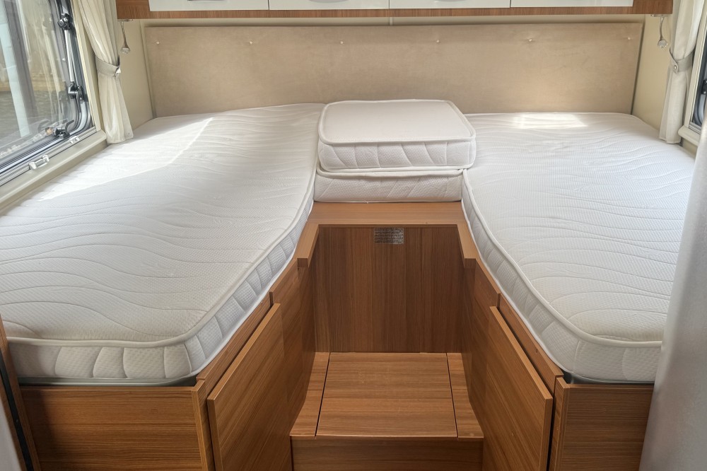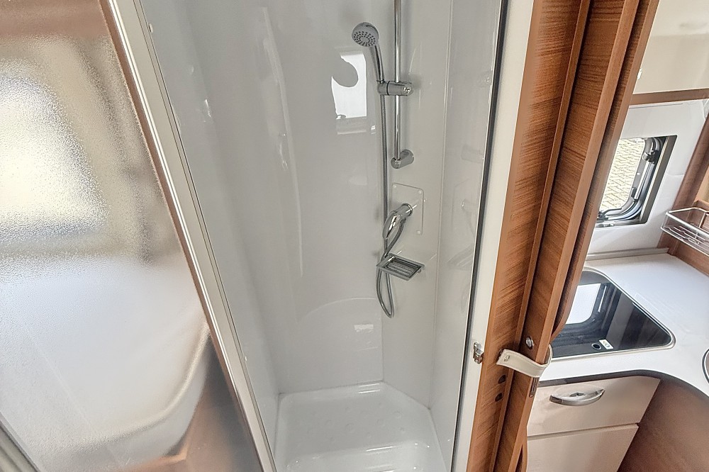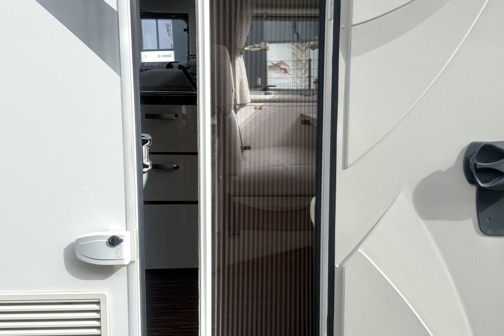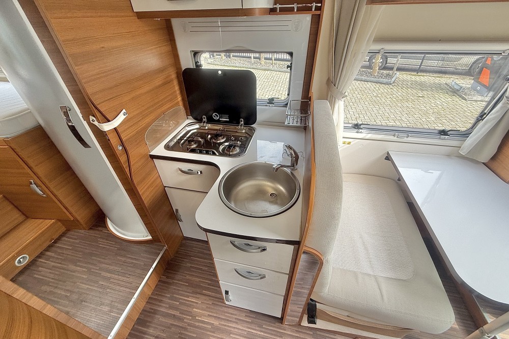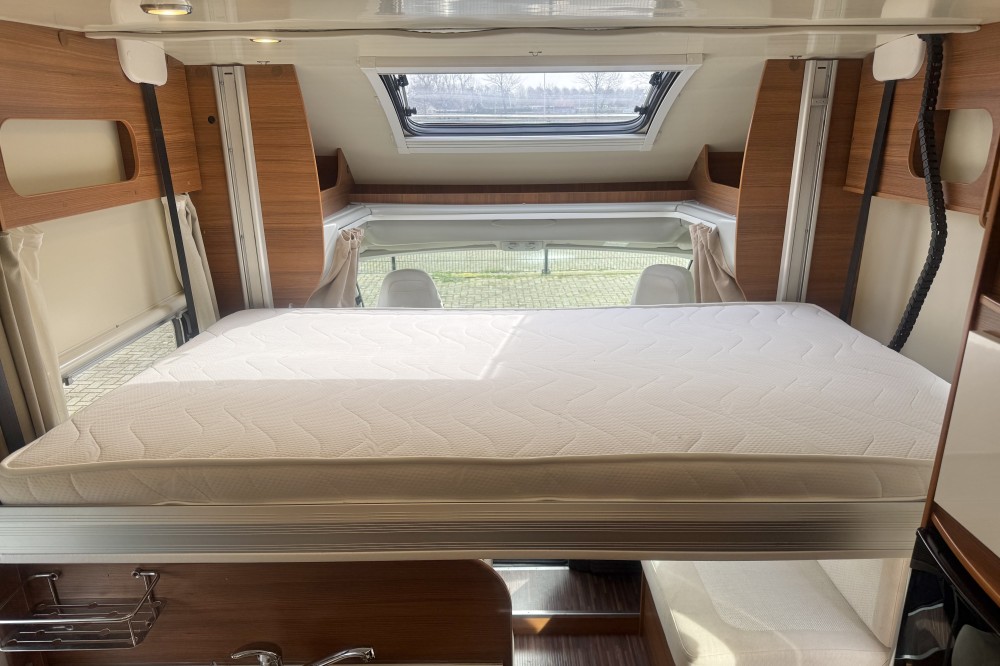 2 lengtebedden (2x 200×85) , Een aparte afsluitbare douche, een toiletruimte met een wastafel en een draaibaar toilet, de keuken is voorzien van een 3-pits gaskomfoor, rvs spoelbasin en een xxl koelkast met aparte vriezer, een ruime 5-persoons dinette met 2 comfortabele draaistoelen, daarboven een elektrisch verstelbaar hefbed(190×120