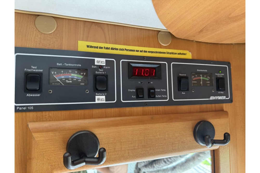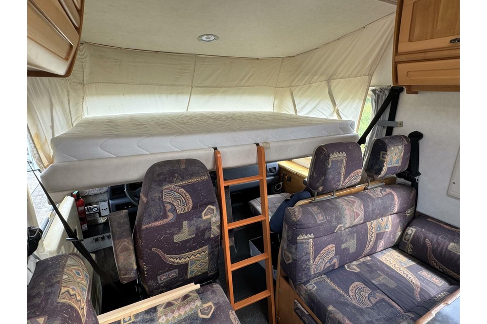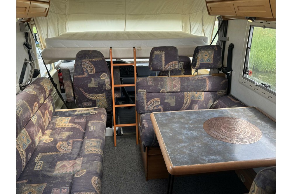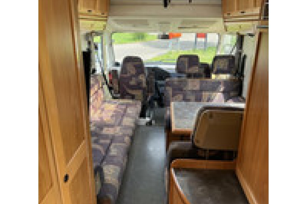 6 Gordels, 2 voorin en 4 door de treinzit achterin, 5 slaapplekken, 2 voorin door het hefbed, 2 door de dinette om te bouwen naar een 2 persoons bed en door de lange bank 1 persoonsbed.