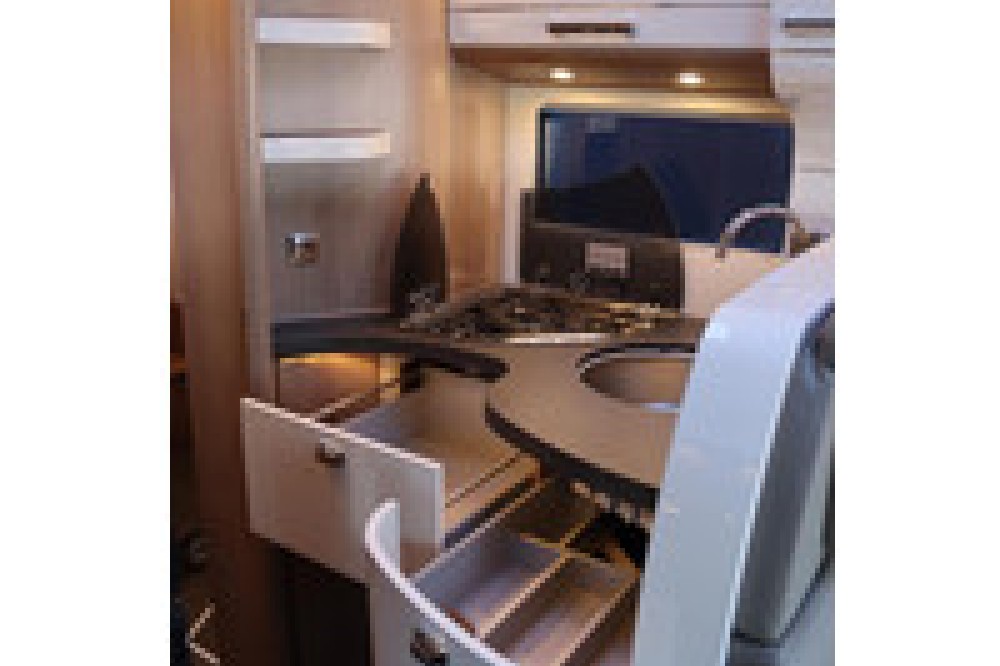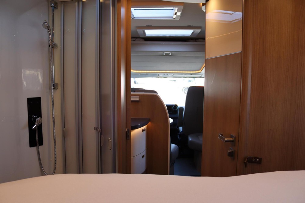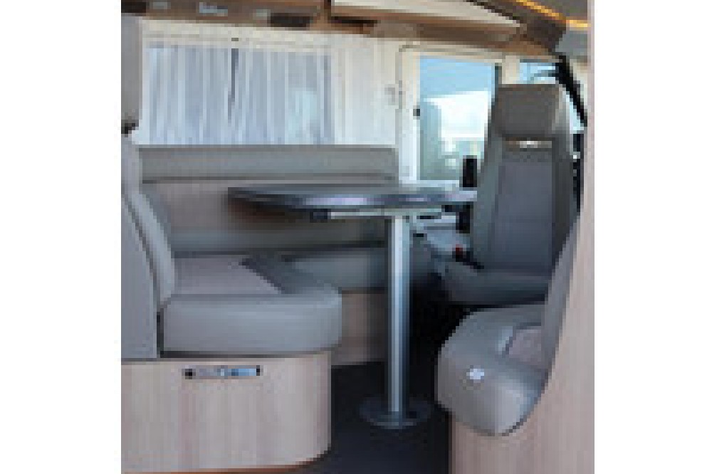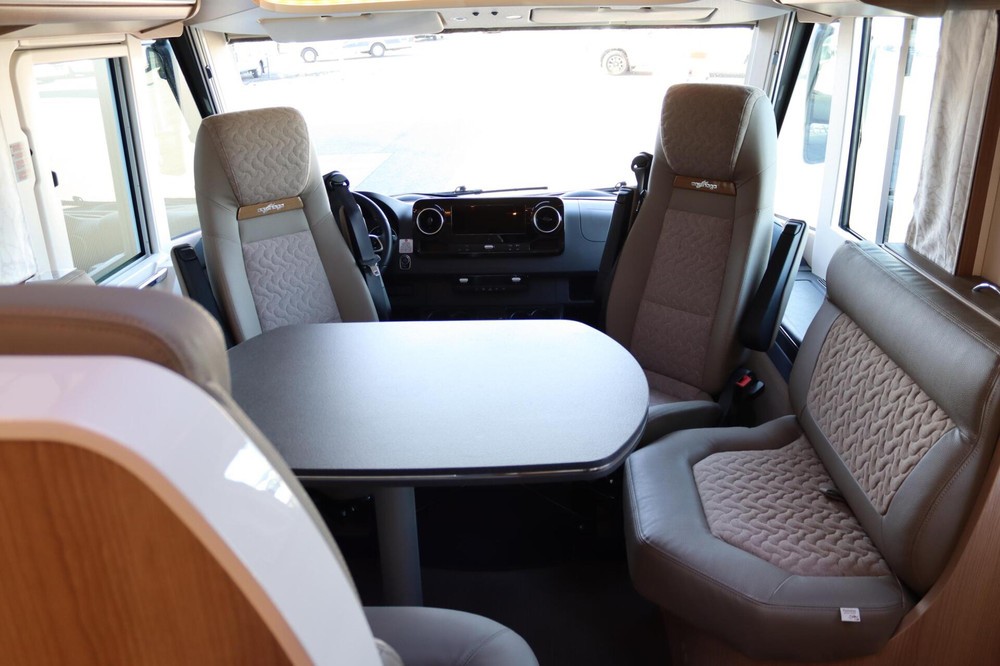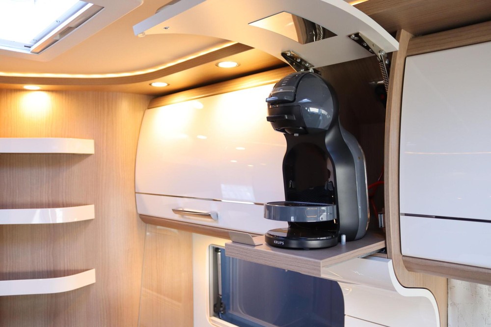 Deze camper biedt een zeer comfortabele indelingen: Grote L-zitgroep met brede kantelbare zijbank in woonkamer die bekleed is met deels leder Macchiato bekleding .In het midden vindt u een Comfort-hoekkeuken met gebogen werkblad en sfeerverlichting in de vloerplinten