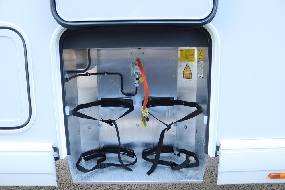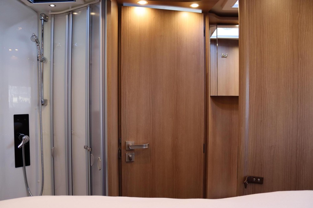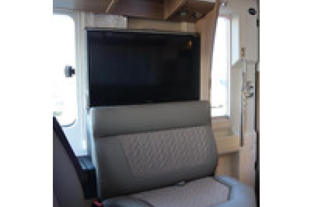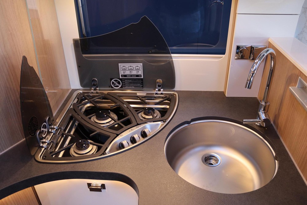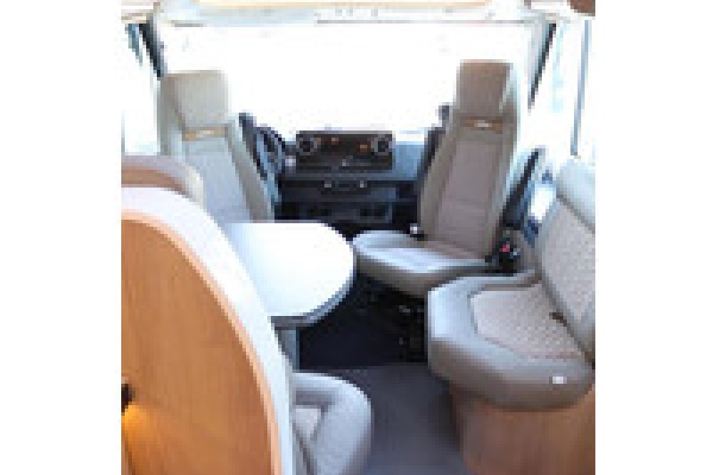 Deze camper biedt een zeer comfortabele indelingen: Grote L-zitgroep met brede kantelbare zijbank in woonkamer die bekleed is met deels leder Macchiato bekleding .In het midden vindt u een Comfort-hoekkeuken met gebogen werkblad en sfeerverlichting in de vloerplinten