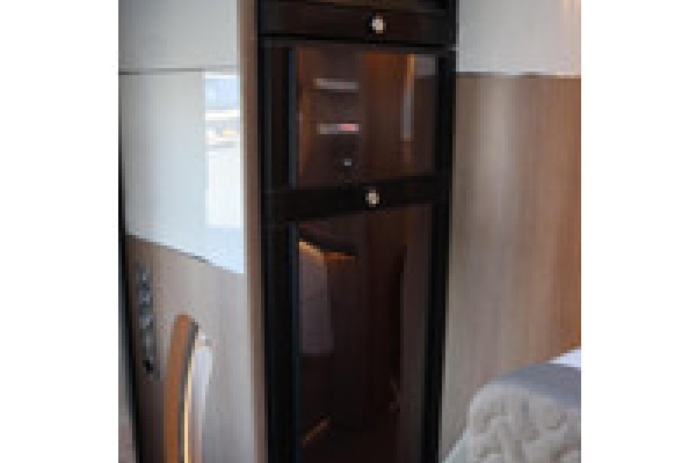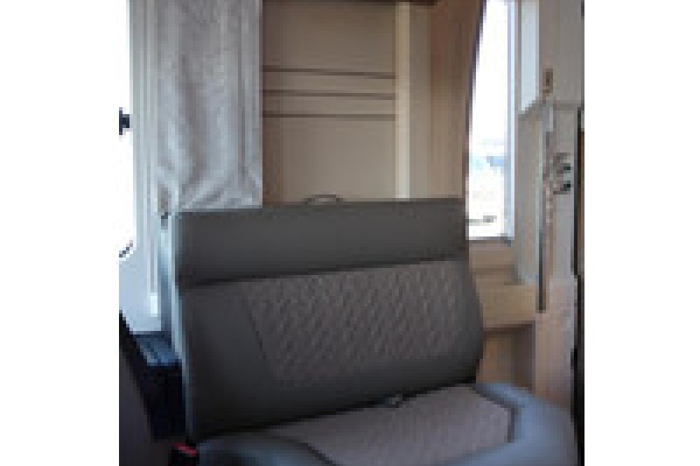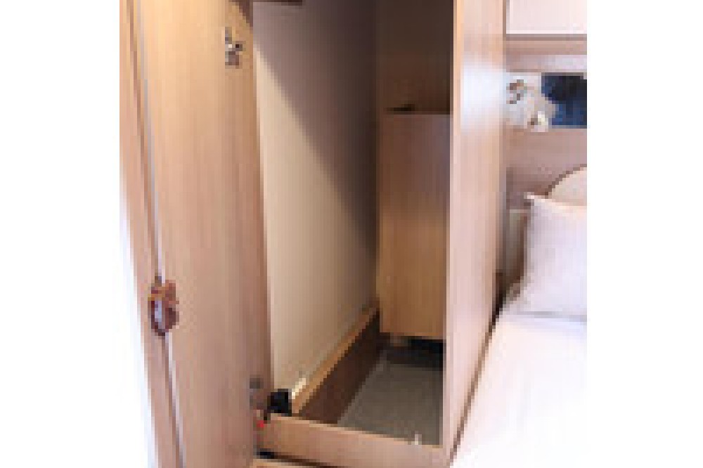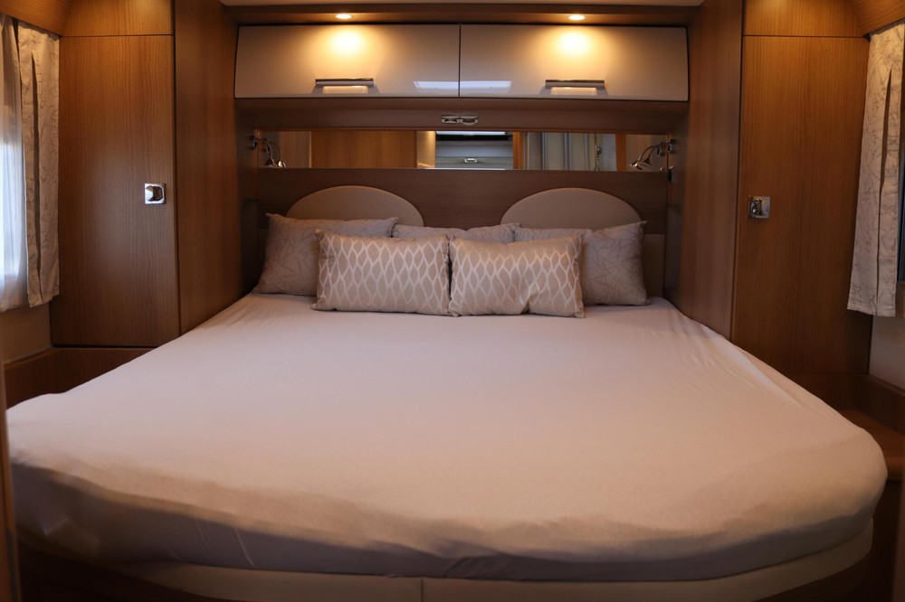 Het slaapgedeelte is uitgerust met een groot Queensbed waarvan de hoofdsteunen omhoog kunnen klappen waardoor er meer ruimte is om langs het bed te lopen. Ook zijn er veel kasten en lades in en rond het bed.