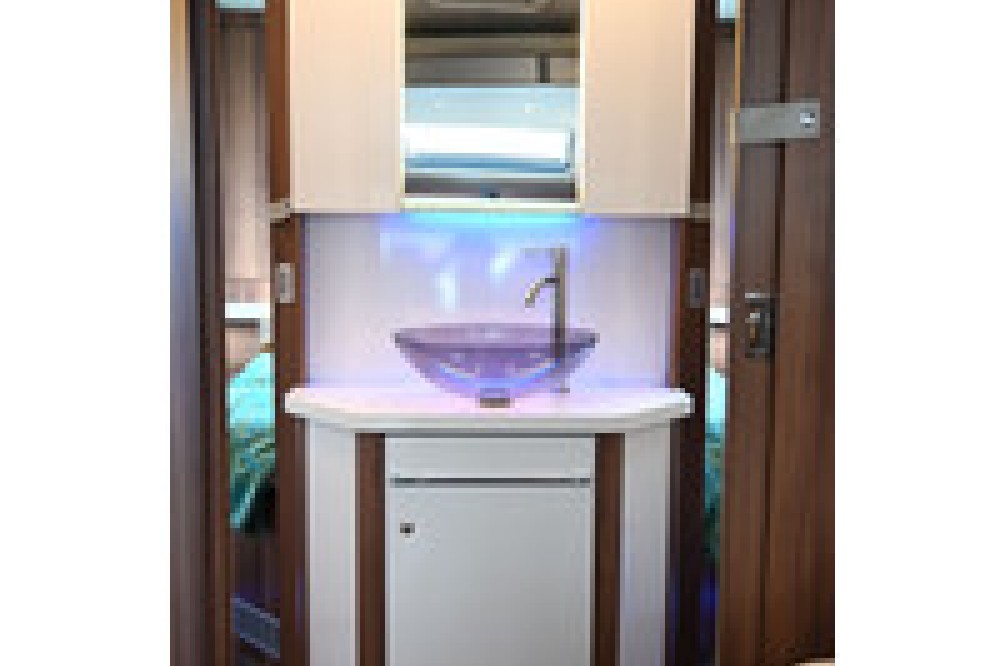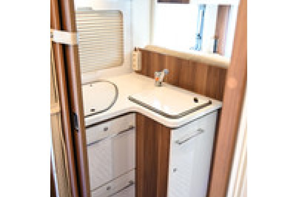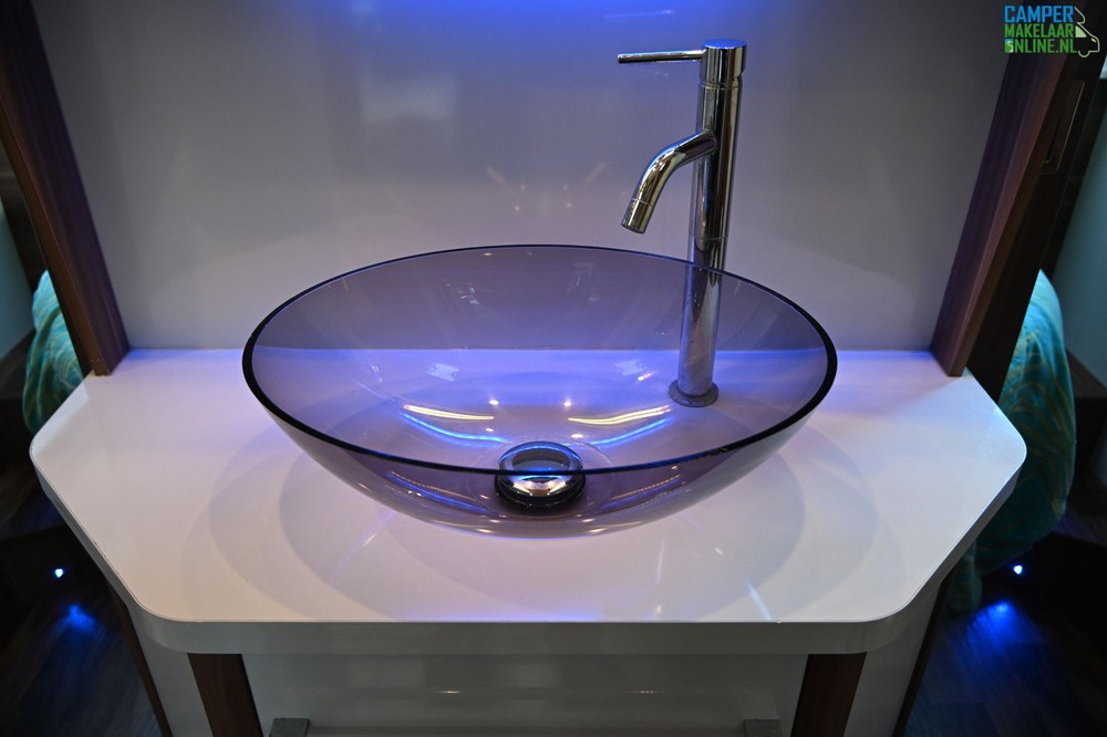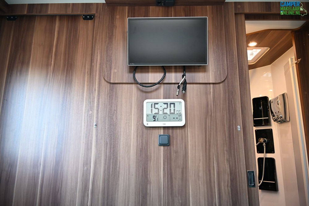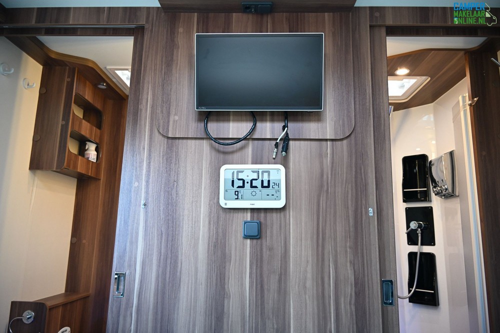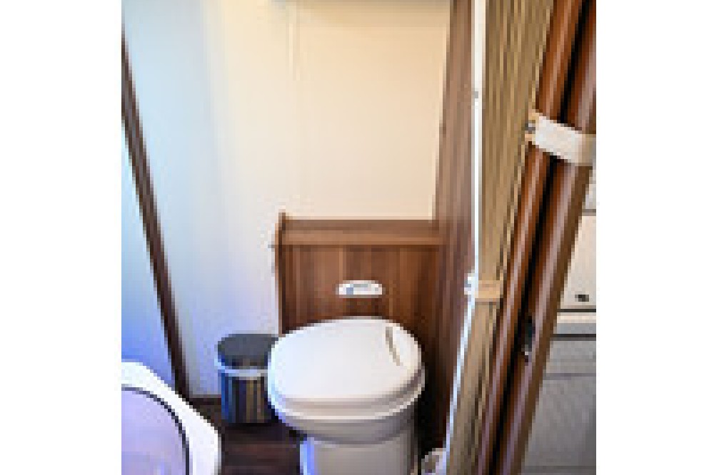 Aparte douche/toilet: De badkamer is slim ingedeeld met een aparte douchecabine en een toiletruimte, die samen kunnen worden afgesloten van de rest van de camper.