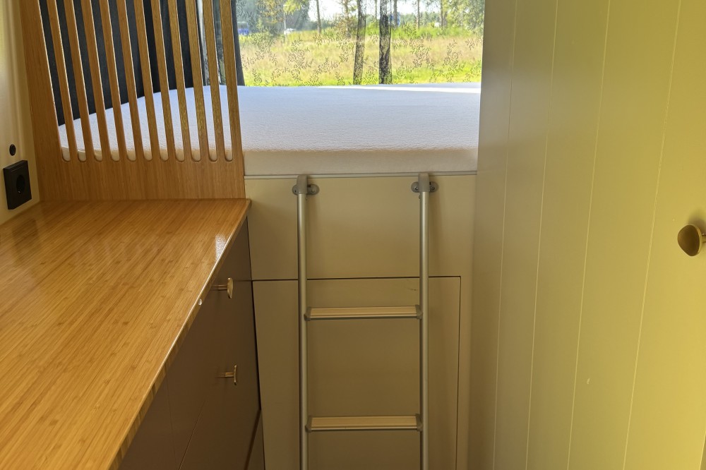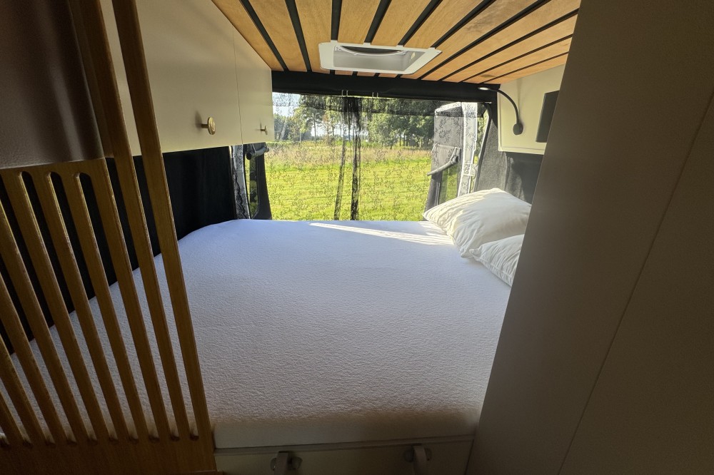 - MaxxFan boven het bed voor ventilatie tijdens warme nachten