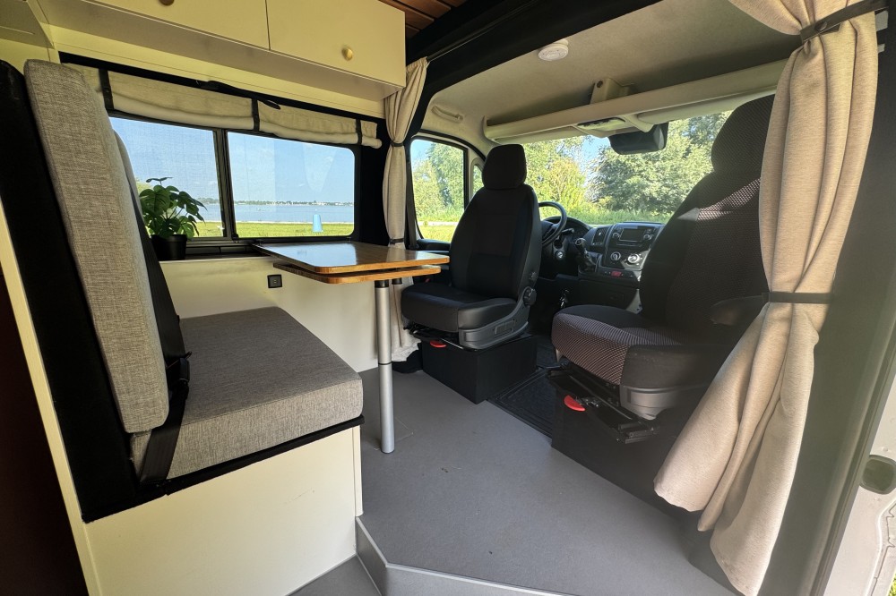 - Gezellige zithoek door draaibare voorstoelen (Atrion campers)