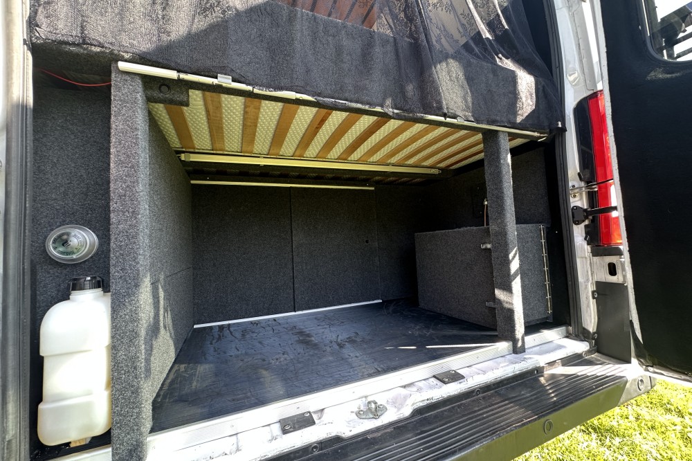 - Vast bed achterin van 140 x 200 cm met lattenbodem en dik matras