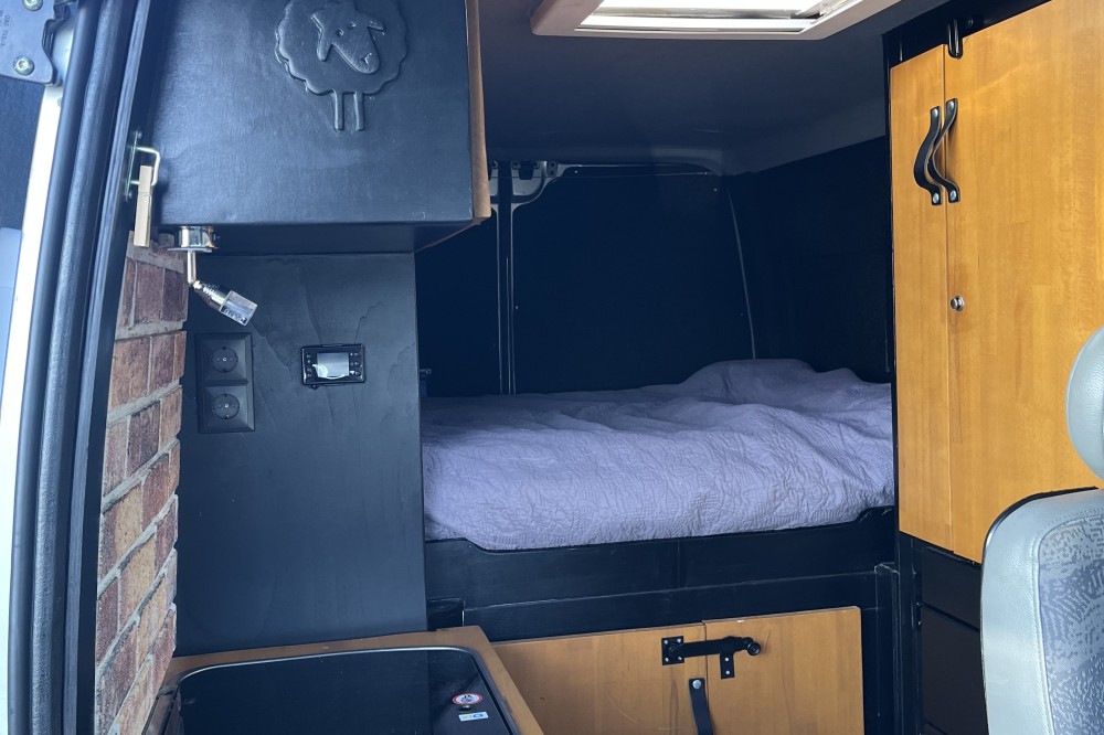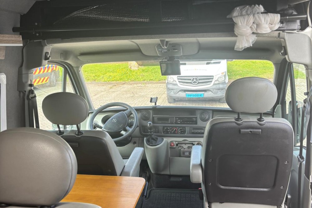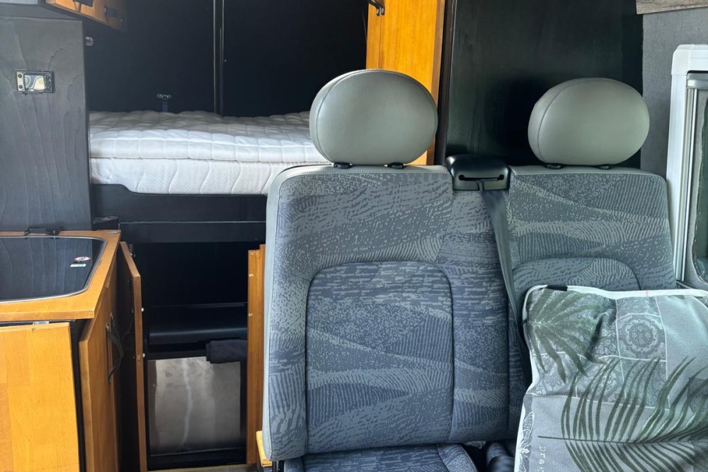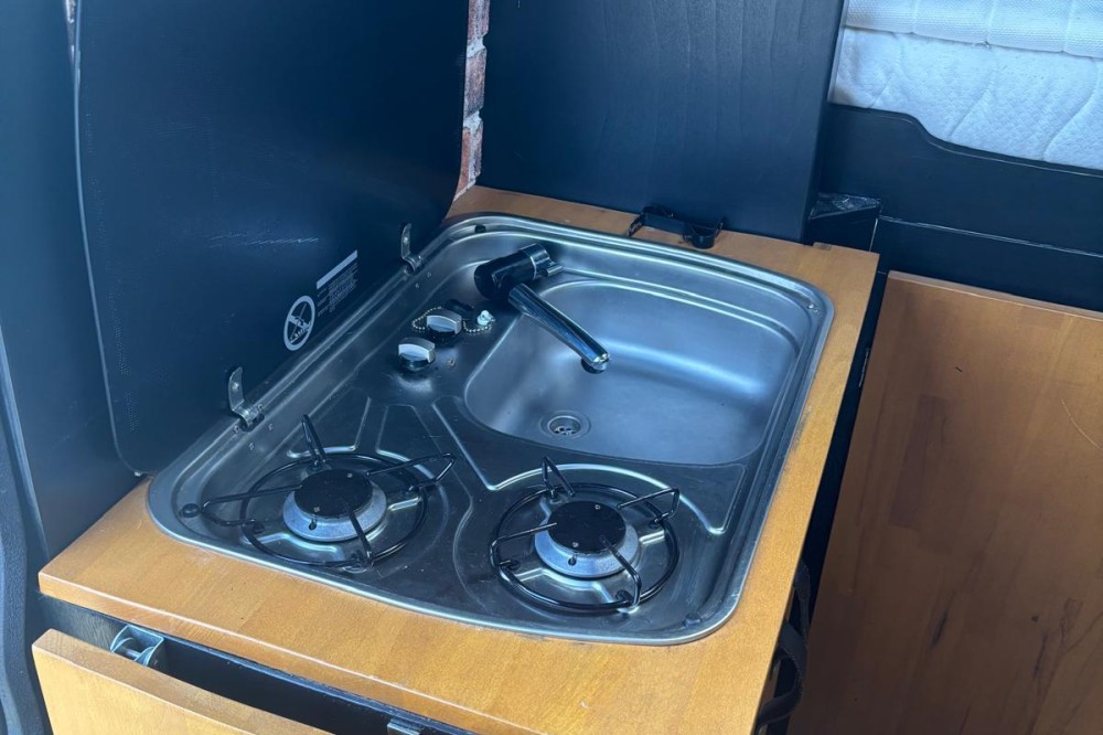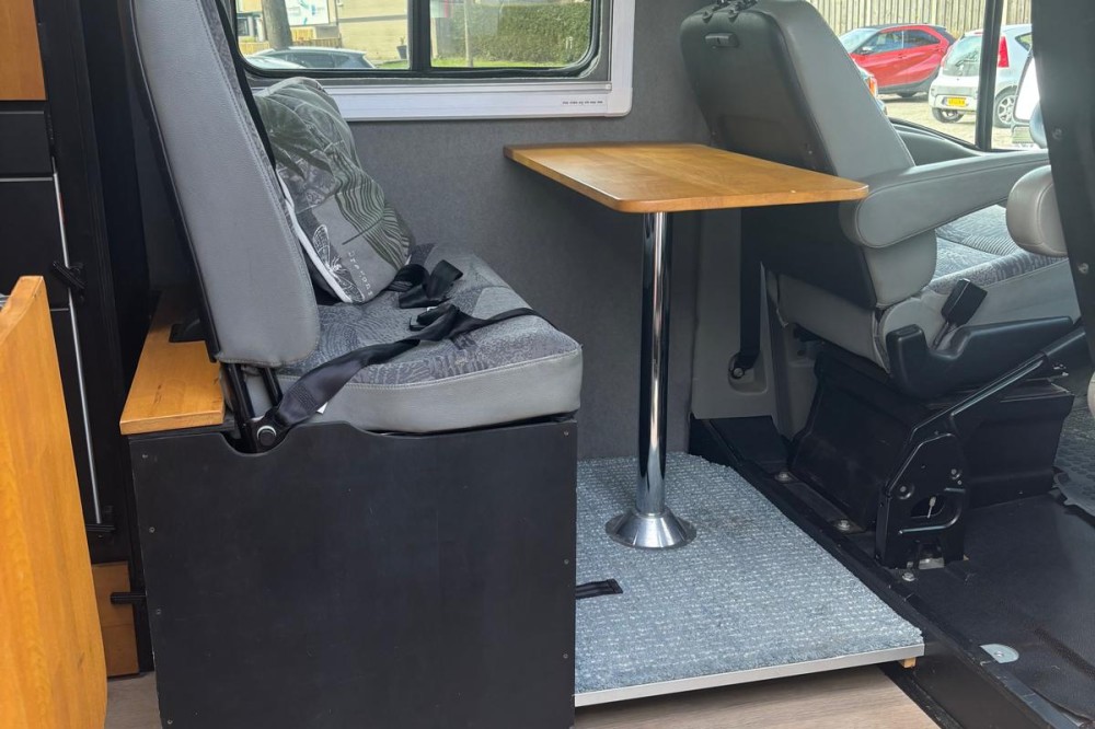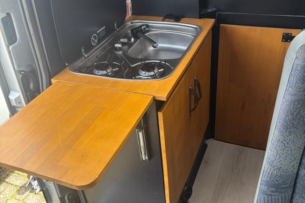 De camper is compleet uitgerust met een fijn 2-persoonsbed (180x140). Het bed is vrij hoog, waardoor er erg veel bergruimte onder het bed is. In de keuken is een 2 pitsfornuis en een spoelbak met koud stromend water. De schoon- en vuilwatertank zijn 20l en uitneembaar. Rondom de keuken en aan het voeteinde van het bed is veel kastruimte. Onder het bed (goed bereikbaar vanuit de keuken) staat de grote koelbox. De keuken kan met een opklapblad vergroot worden. Tegenover de schuifdeur bevind zich een bankje met tafel, samen met de draaibare voorstoelen maakt dit een gezellige zit voor 4 personen. Op alle zitplekken zijn gordels aanwezig. De ramen in de zijkant en het dakluik zijn voorzien van horren en verduisterende gordijnen. Voor de cabine ramen is er een isolerende binnen- en buitenlichtwering. De porto potti staat in de laadruimte en kan desgewenst in de leefruimte of buiten worden geplaatst.