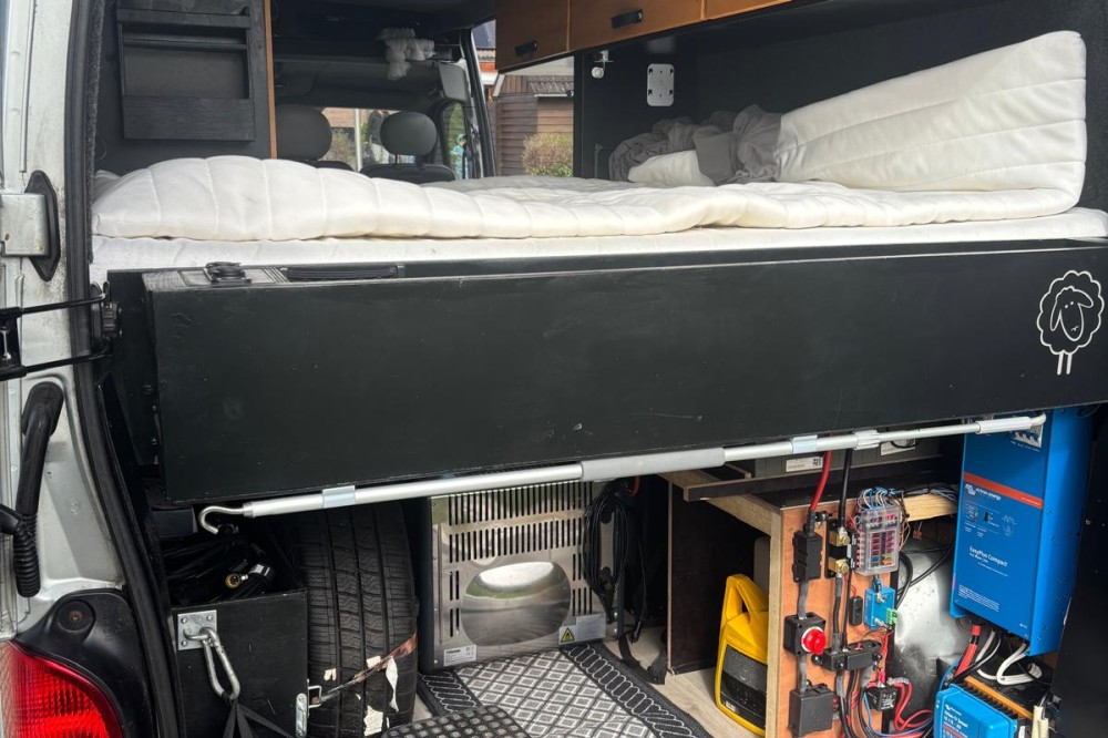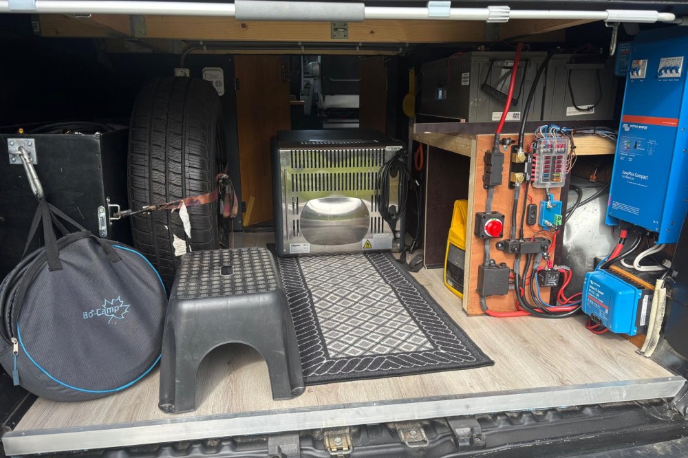 In de grote laadruimte onder het bed bevinden zich het reservewiel, de vuil- en schoonwatertank, de gasfles, de dieseltank van de standkachel, de koelbox en de elektrische installatie waardoor je in combinatie met de zonnepanelen off grid kan staan en toch het koffiezetapparaat en de elektrische oven kan gebruiken. Kabels voor de elektra zijn natuurlijk ook aanwezig. En dan blijft er nog genoeg ruimte voor stoelen, tafel, kindertent,supboard enzovoort over.