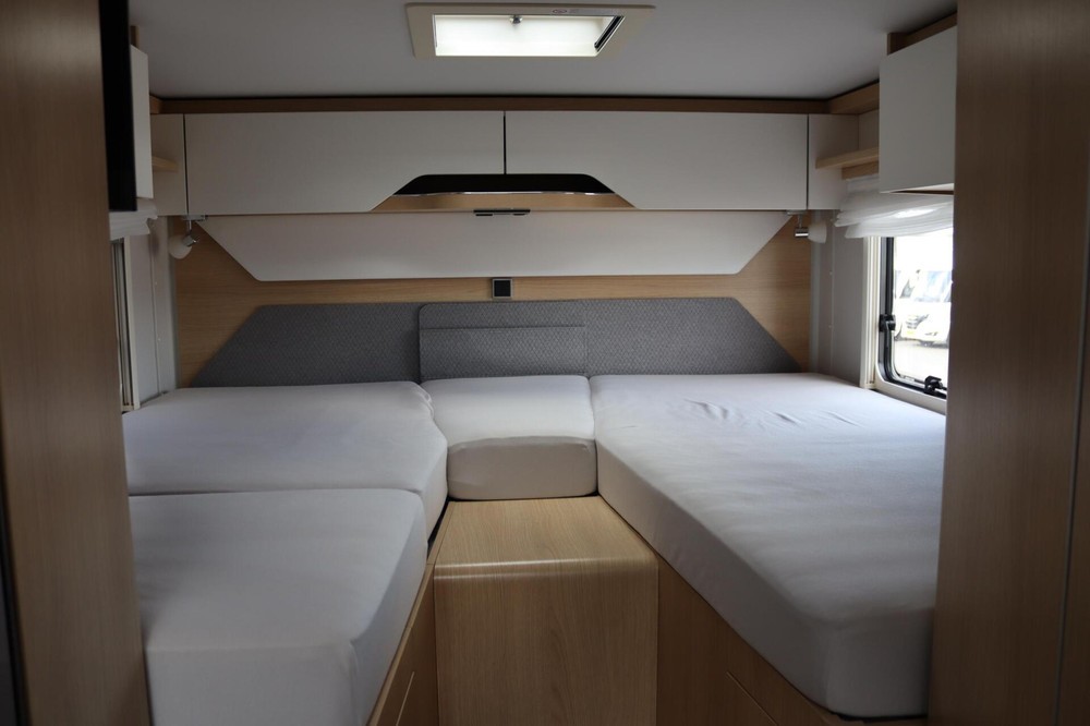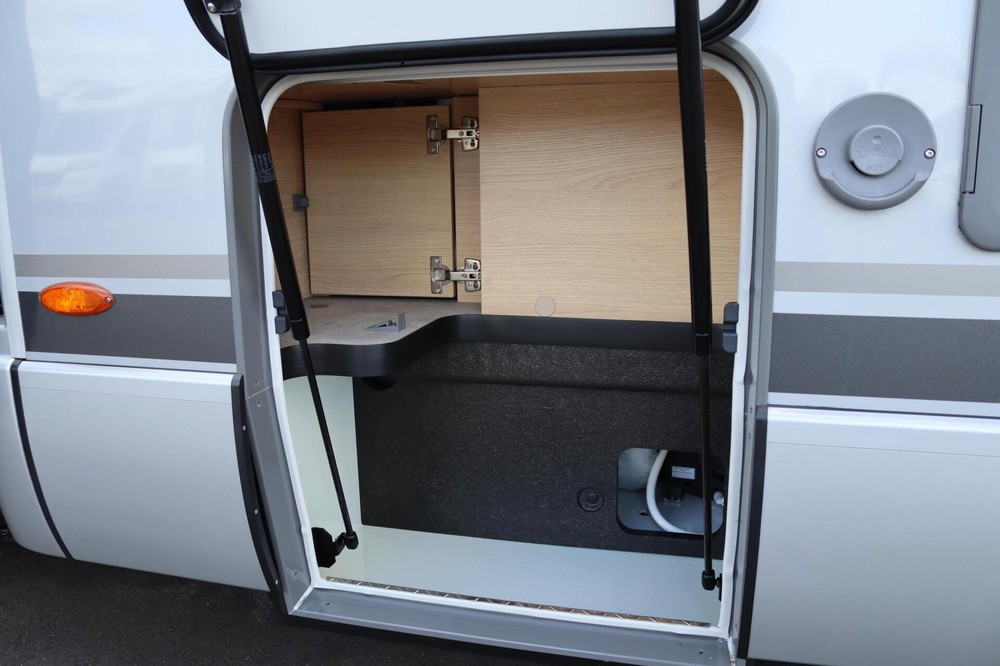 Luxe en praktische detailsDe Hymer BMC-T 580 biedt een ruime zithoek met een L-zit die ontstaat door de draaibare voorstoelen. Het elegante Grand Oak meubeldecor in combinatie met de luxe Bogota bekleding zorgt voor een verfijnde uitstraling. Dankzij de dubbele bodem, die verwarmd is en extra opbergruimte biedt, kun je jouw spullen veilig en droog opbergen. De 180 liter schoonwatertank en de 150 liter vuilwatertank zijn weggewerkt in de dubbele bodem, terwijl je vanuit de buitenkant eenvoudig toegang hebt tot de opslagruimte. De ruime garage heeft een laadhoogte van 132 cm, is aan beide zijden toegankelijk en biedt voldoende ruimte voor uw fietsen, scooter en bagage.