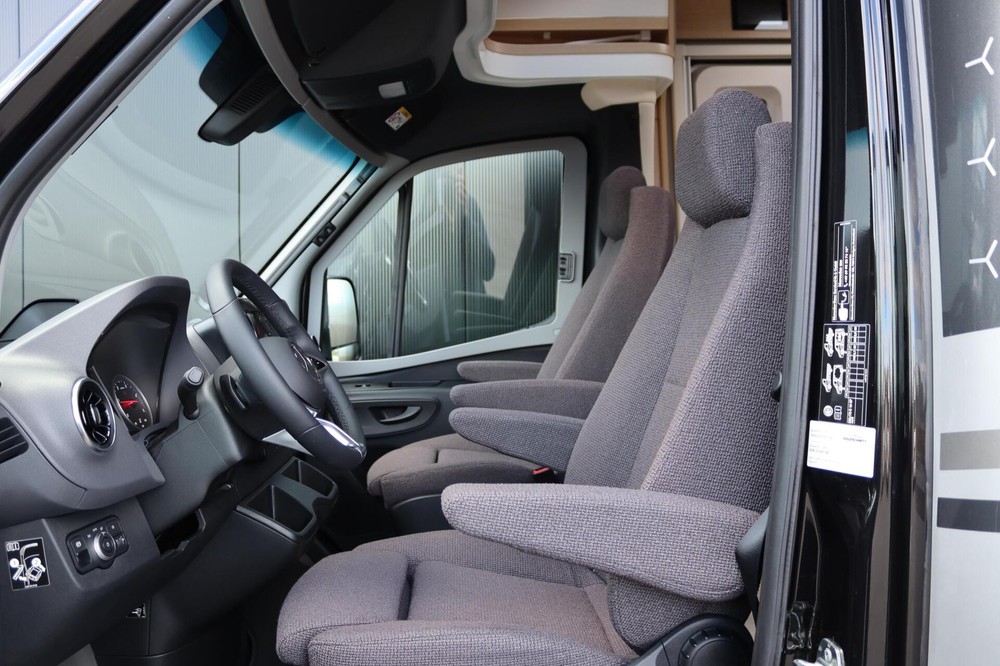 Panorama cabine met toptechnologieIn de cabine van de Hymer BMC-T 580 geniet je van een panoramisch uitzicht, zodat je niet alleen de omgeving optimaal kunt bewonderen, maar ook tijdens het rijden goed overzicht hebt op het verkeer. Het Mercedes-Benz MBUX multimedia systeem zorgt voor een soepele navigatie- en entertainmentervaring, terwijl de luxe pilotenstoelen, die volledig verstelbaar en draaibaar zijn, het comfort verhogen.