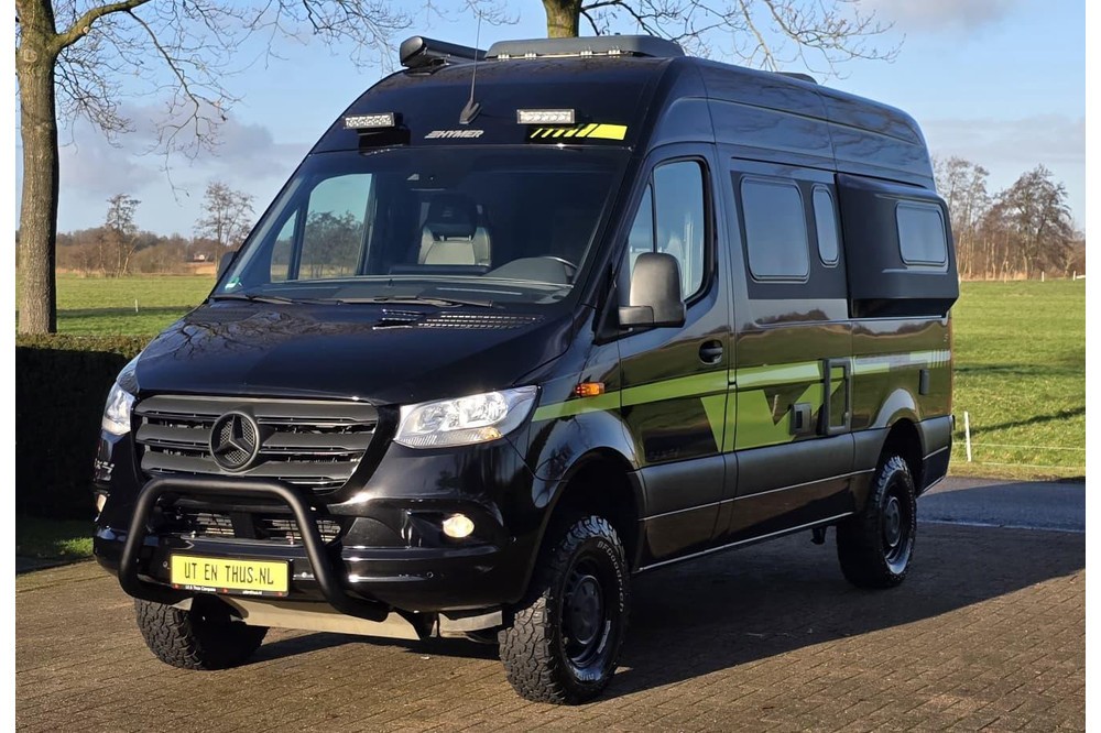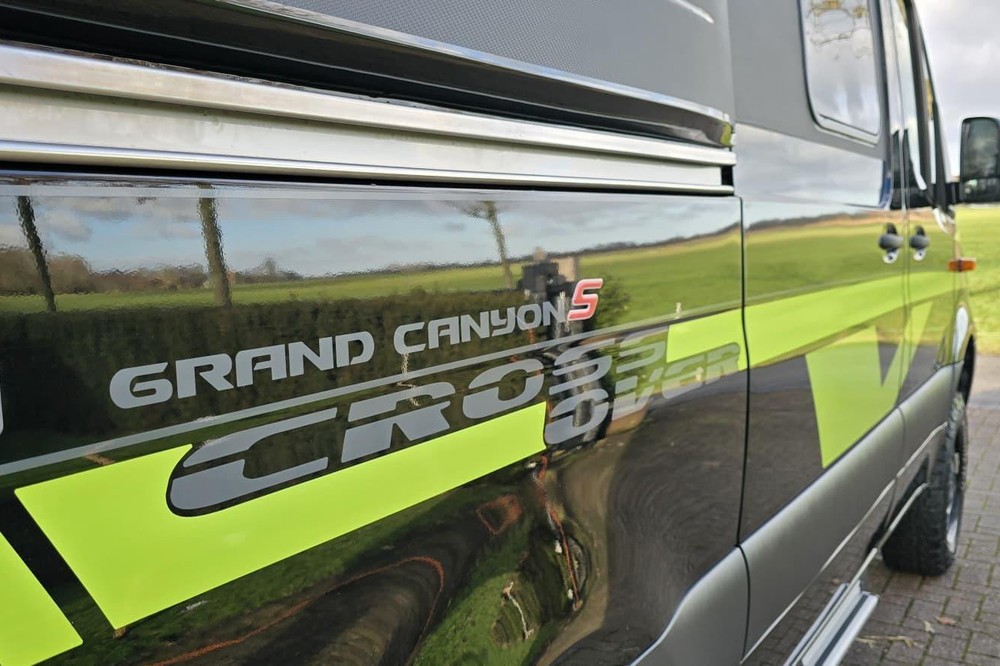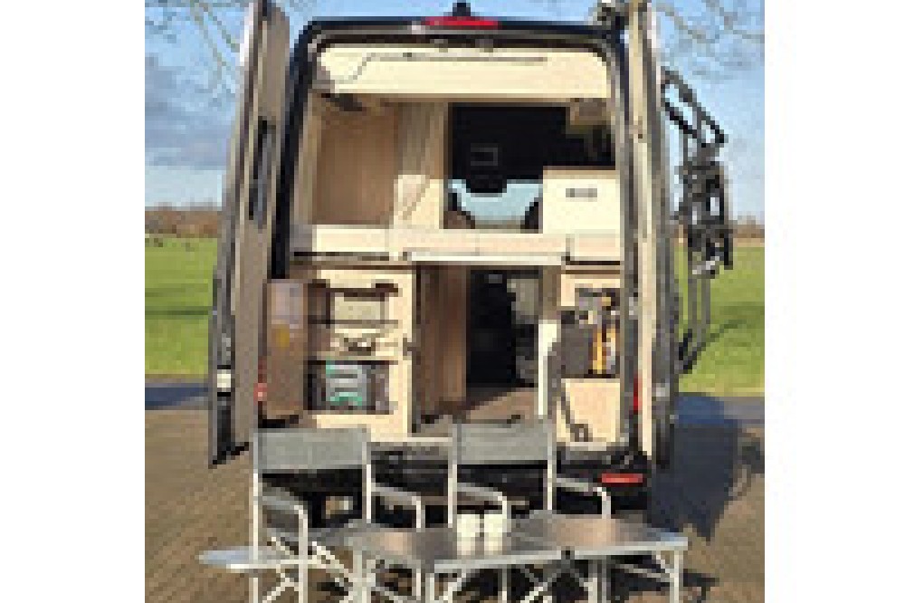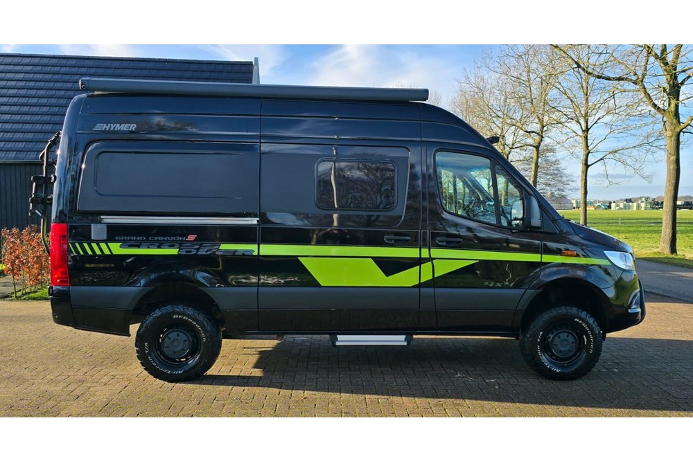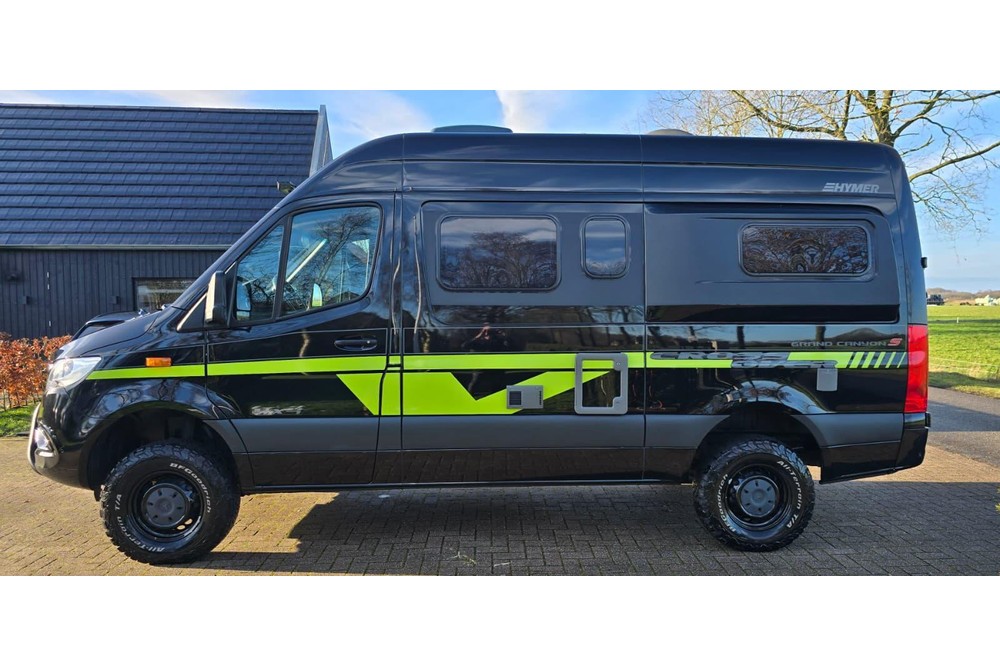 - Hymer CrossOver pakket met o.a. zwart metallic lak, design bestickering, gereedschapset (inklapbare schep, bijl), campingstoelen en -tafel, antraciet kastfrontjes en bodembeschermingsplaat