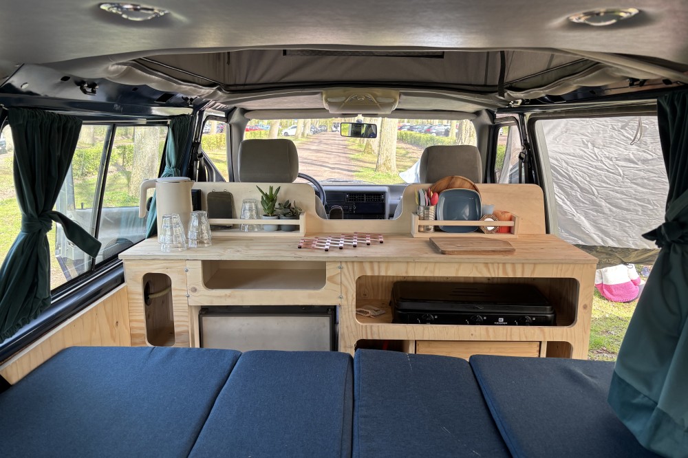 De camper is uitgerust met moderne extra’s zoals Apple CarPlay, een achteruitrijcamera en VictronConnect, zodat je via de app precies kunt zien hoe vol de huishoudaccu nog is. Ook is er een buitenstopcontact van 230V aanwezig, ideaal voor bijvoorbeeld een lamp onder de luifel. Dankzij de stuurbekrachtiging rijdt deze T4 bovendien verrassend comfortabel, ook tijdens langere ritten.
