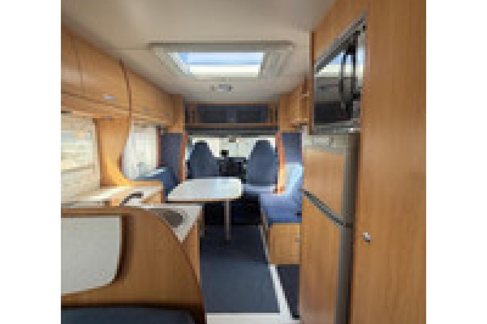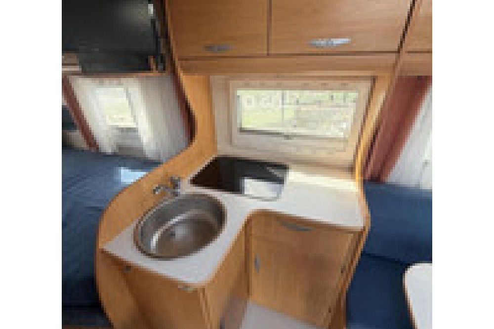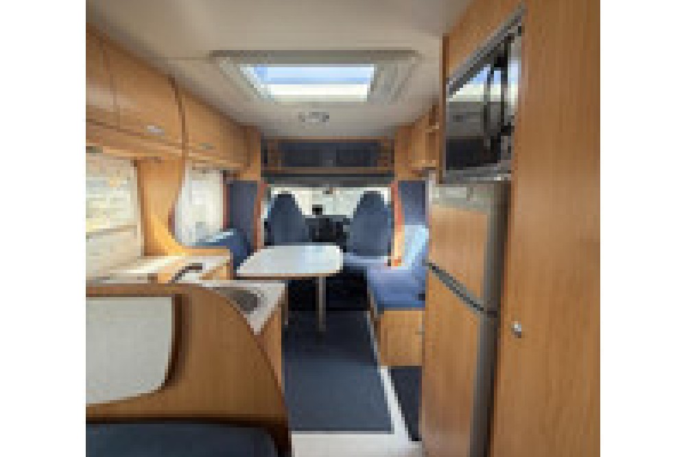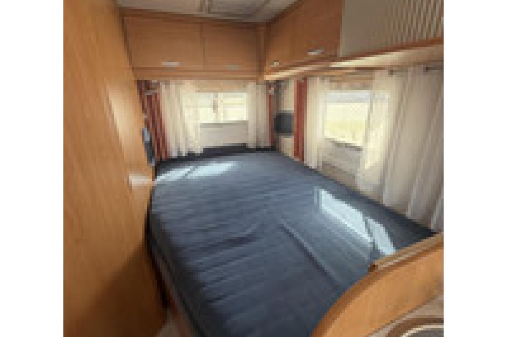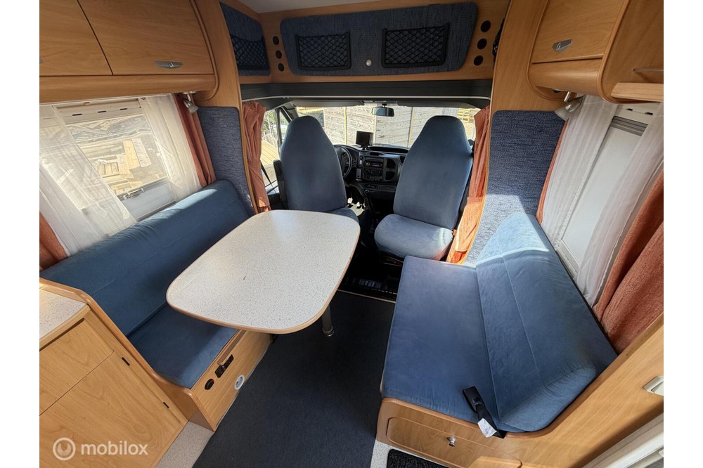 De indeling is praktisch en gezellig, met een ruime rondzit en draaibare voorstoelen waardoor een fijne leefruimte ontstaat. Achterin bevindt zich een comfortabel Frans bed, geschikt voor twee personen. De keuken is compleet uitgerust met een 3-pits gasstel, oven, koelkast met diepvriesvak en voldoende kastruimte.