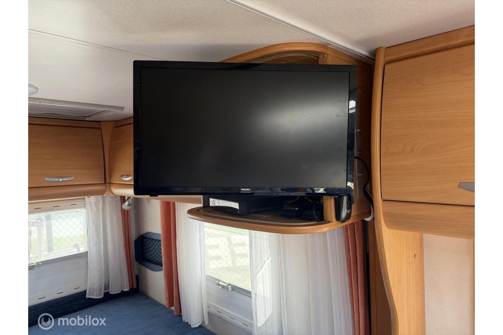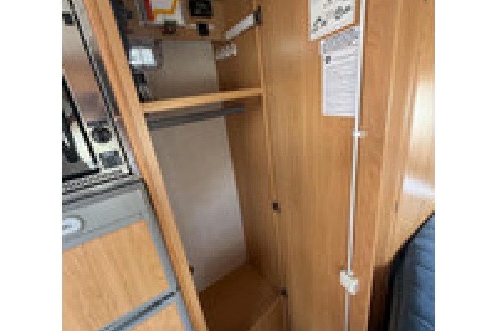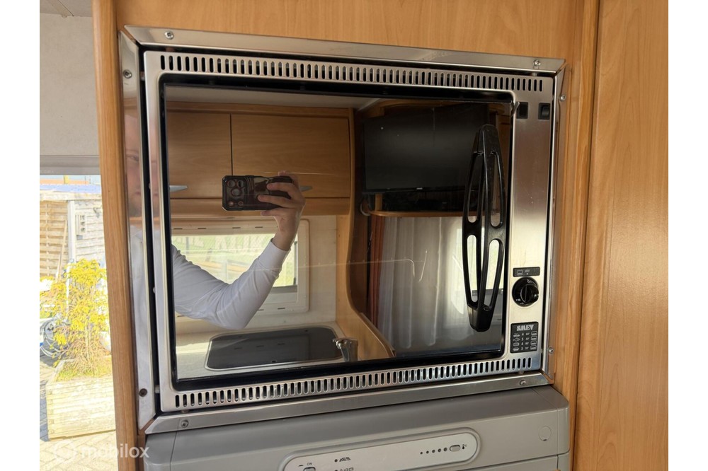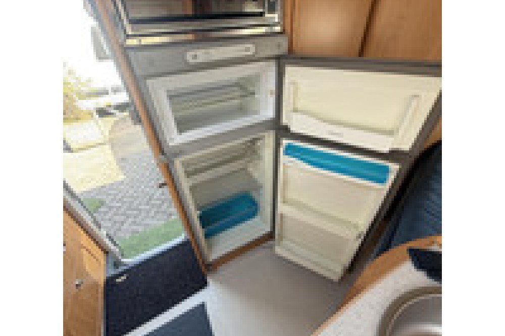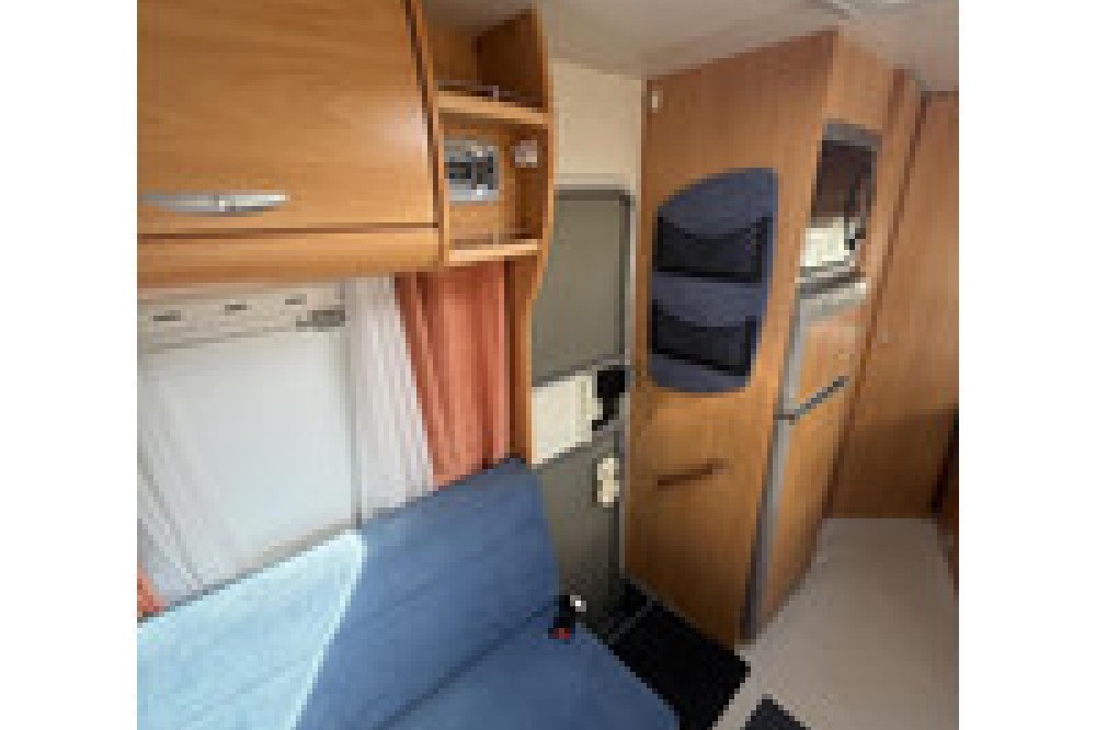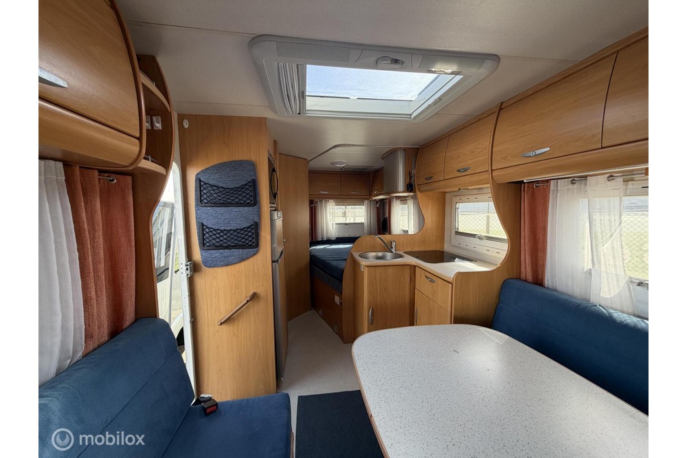 De indeling is praktisch en gezellig, met een ruime rondzit en draaibare voorstoelen waardoor een fijne leefruimte ontstaat. Achterin bevindt zich een comfortabel Frans bed, geschikt voor twee personen. De keuken is compleet uitgerust met een 3-pits gasstel, oven, koelkast met diepvriesvak en voldoende kastruimte.