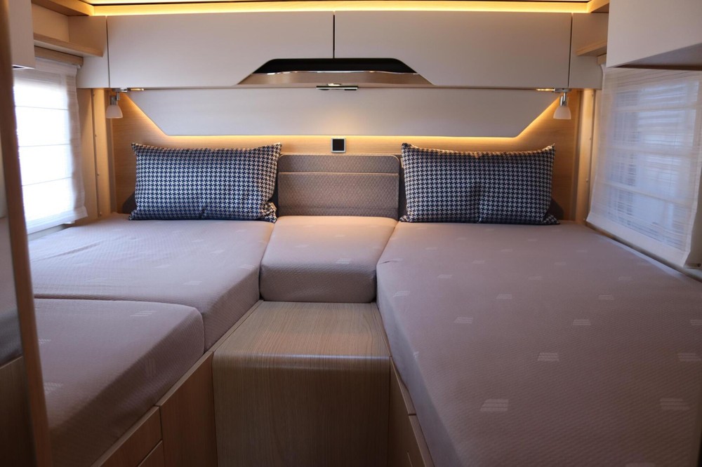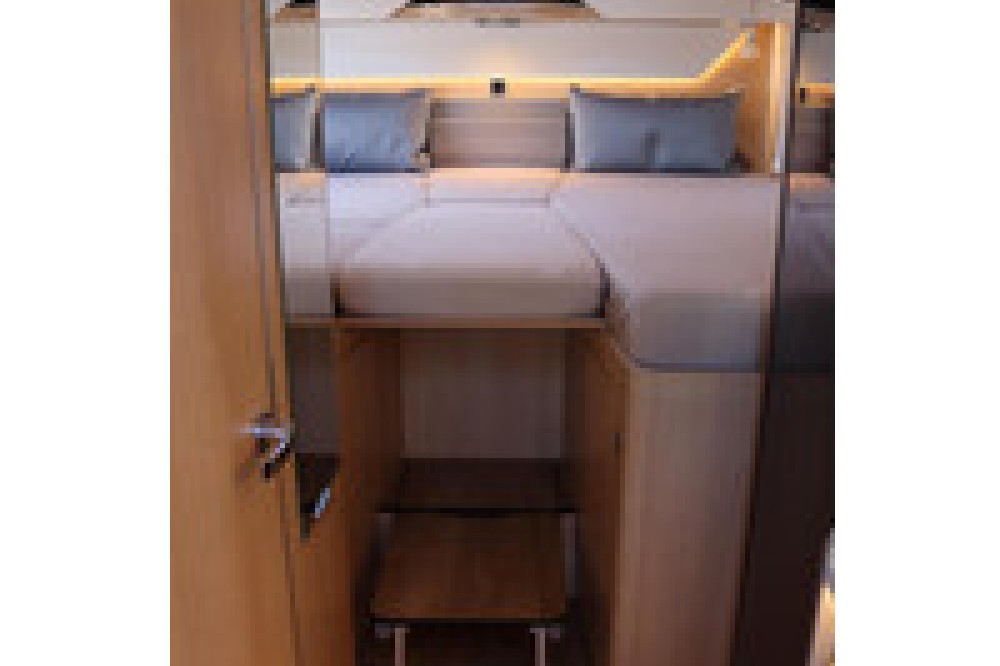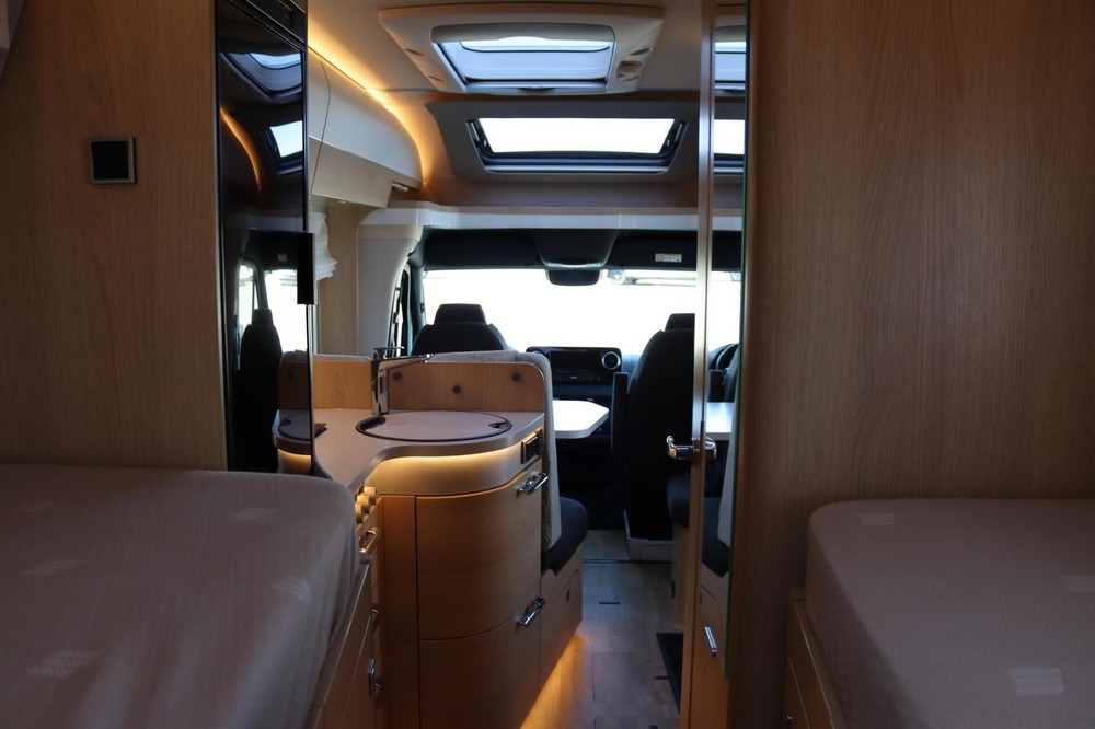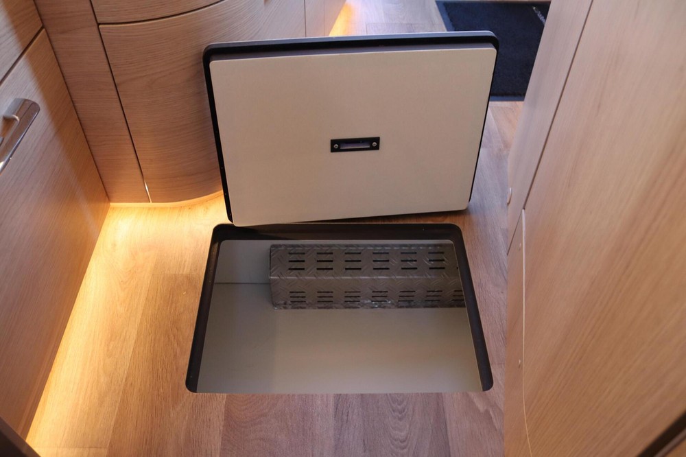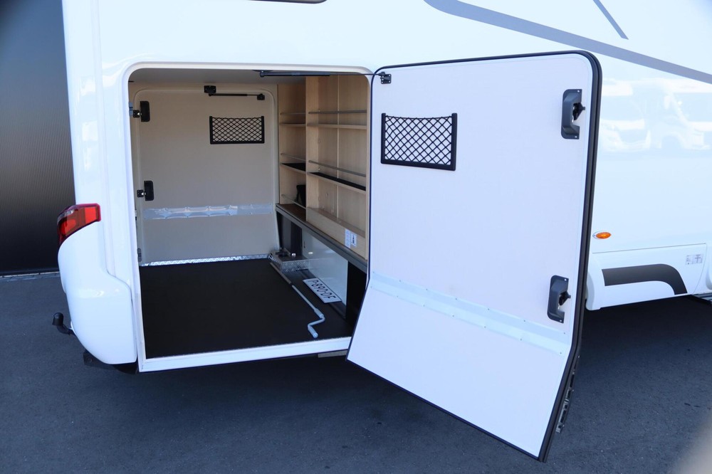 Luxe en praktische detailsDe Hymer BMC-T 600 biedt een ruime zithoek met een L-zit die ontstaat door de draaibare voorstoelen. Het elegante Grand Oak meubeldecor in combinatie met de luxe Kitami bekleding zorgt voor een verfijnde uitstraling. Dankzij de dubbele bodem, die verwarmd is en extra opbergruimte biedt, kun je jouw spullen veilig en droog opbergen. De 180 liter schoonwatertank en de 150 liter vuilwatertank zijn weggewerkt in de dubbele bodem, terwijl je vanuit de buitenkant eenvoudig toegang hebt tot de opslagruimte. De ruime garage heeft een laadhoogte van 132 cm, is aan beide zijden toegankelijk en biedt voldoende ruimte voor uw fietsen, scooter en bagage.