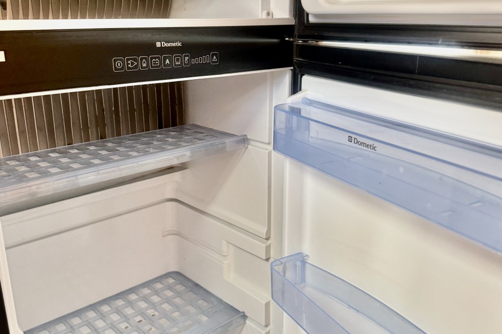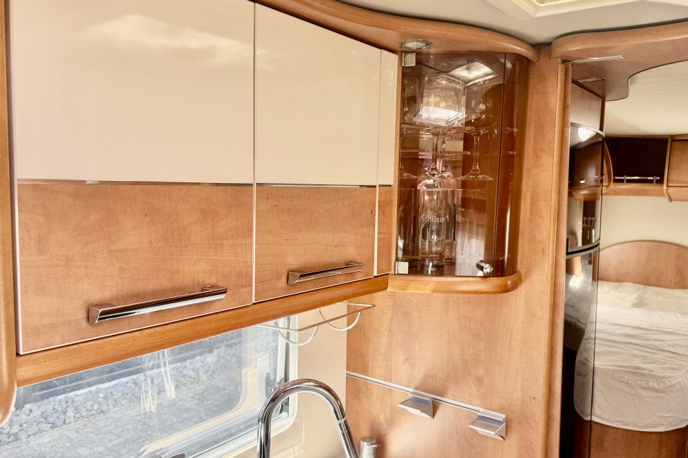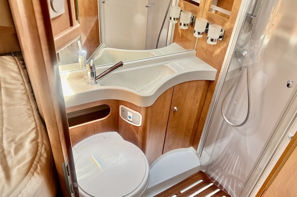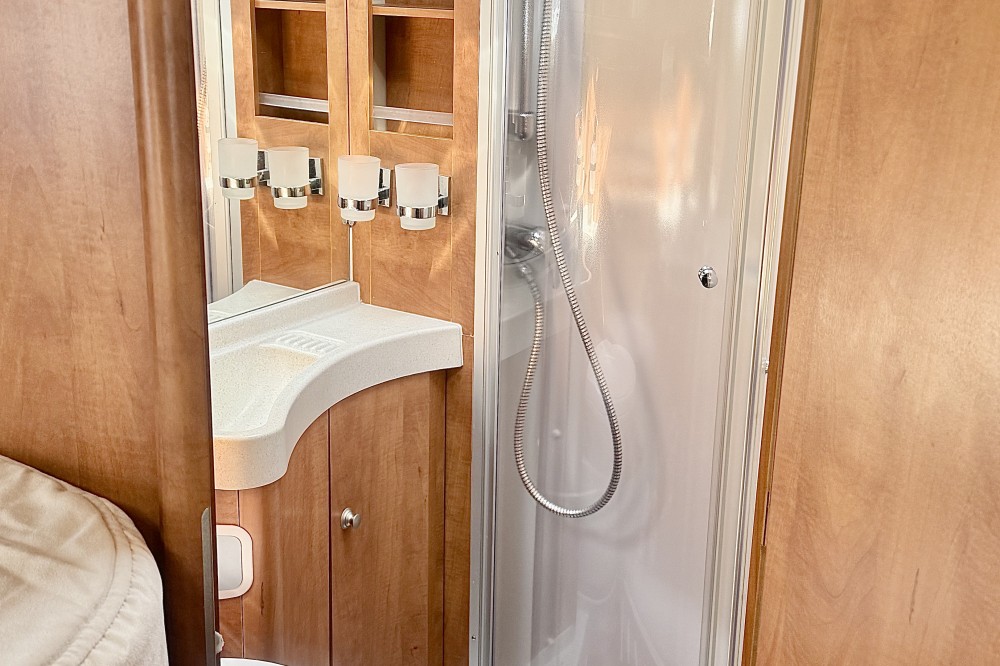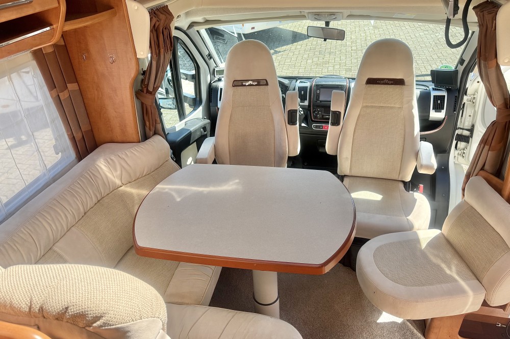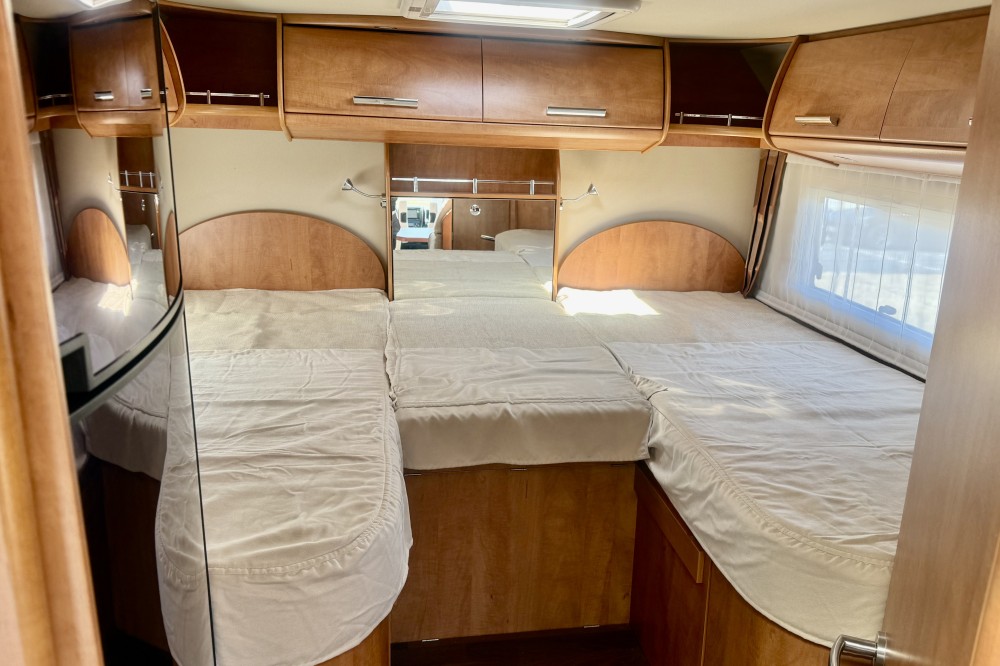Achterin 2 lengtebedden(183×75+193×75), de badkamer met een draaibaar toilet, wastafel en douche, een ruime 5-persoons dinette met 2 comfortabele draaistoelen, de keuken is voorzien van een 3-pits gaskomfoor met vonkontsteking, RVS spoelbasin en een XXL-koelkast met aparte vriezer