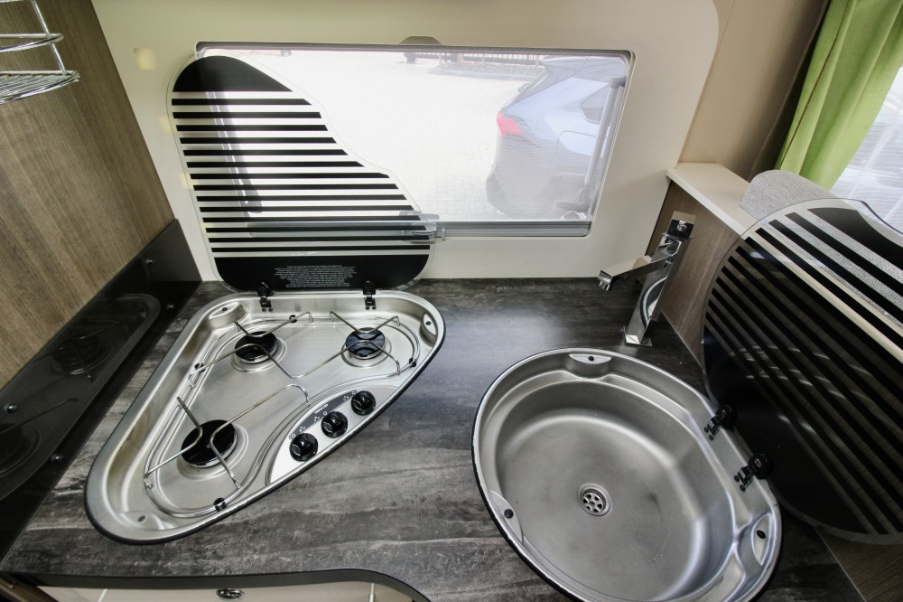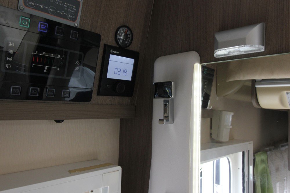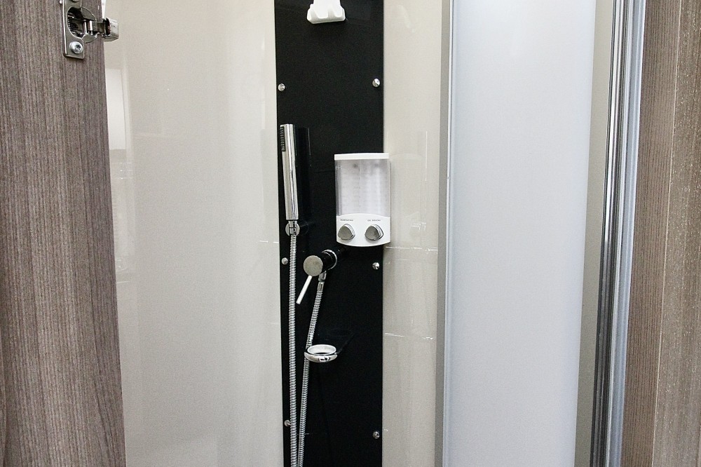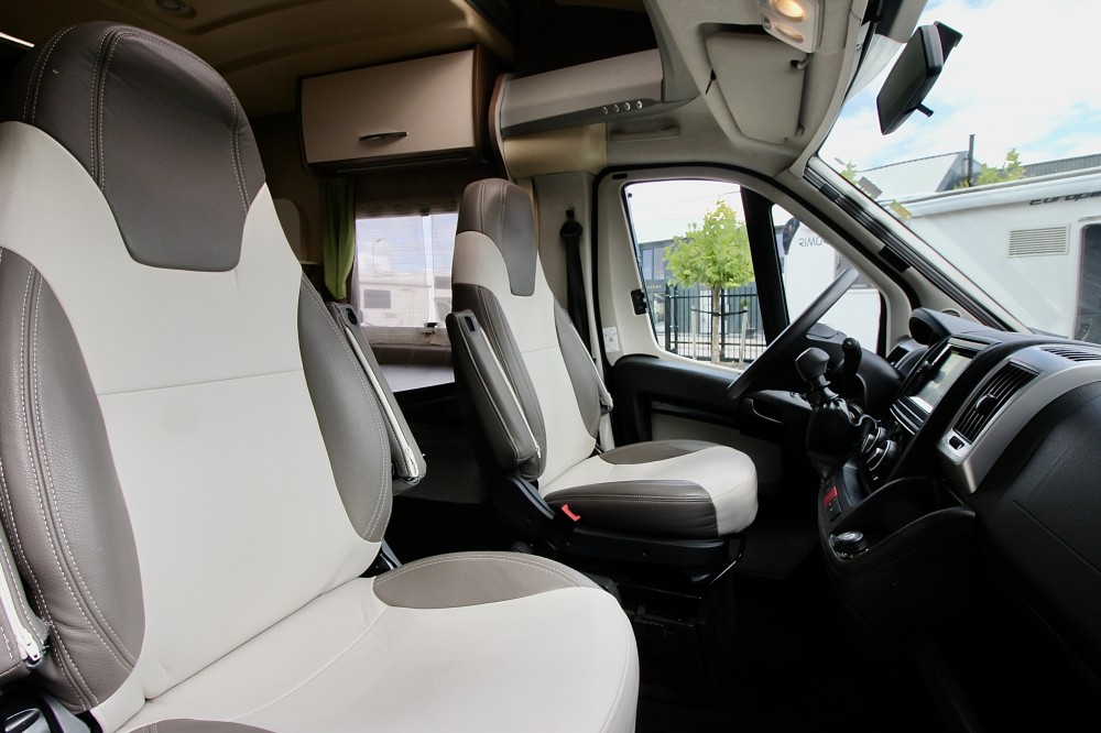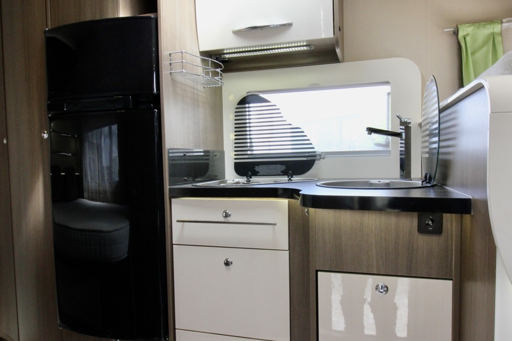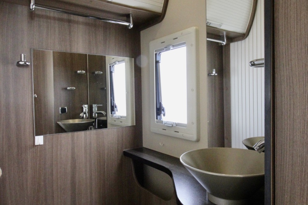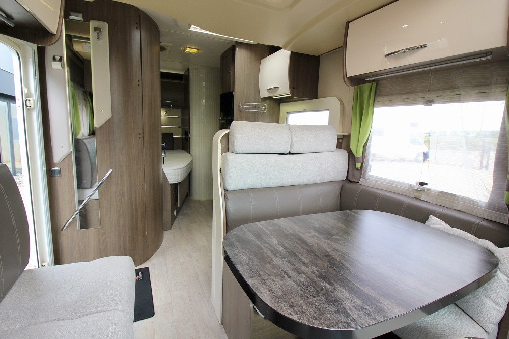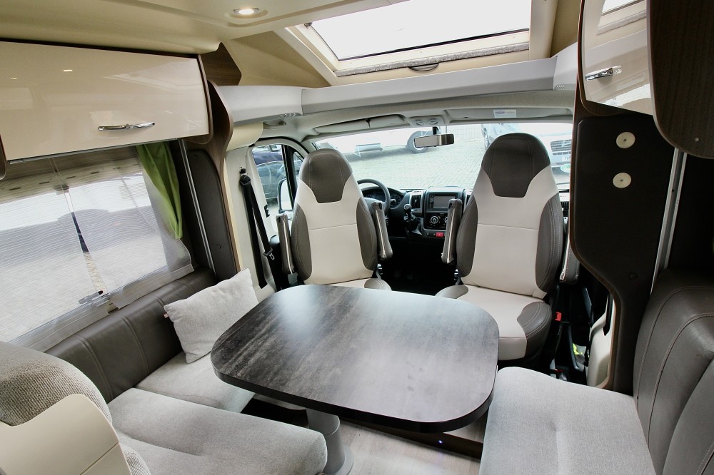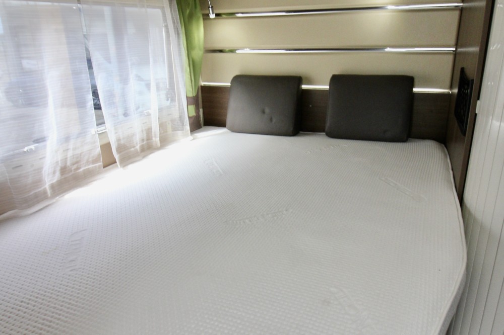 Links achterin groot Queensbed (191×137). Geheel aparte douche. Wastafel en draaibaar toilet in een ruimte. De keuken voorzien van een 3-pits gaskomfoor, RVS wasbak en een automatische XXL koelkast, een zeer ruime 6 persoons dinette met 2 draaistoelen, om te bouwen tot 2 persoons slaapplaats. Daarboven een elektrisch hefbed (192×140)