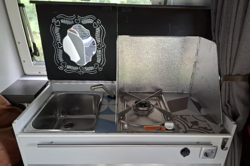 - Koelkast, gasfles, oventje, toilet met toebehoren