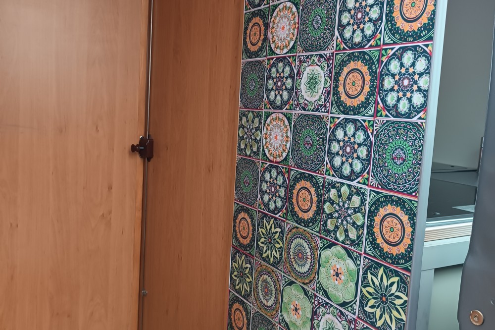 De decoratieve "tegeltjes" in de badkamer en zithoek (zie foto’s) kunnen eenvoudig worden verwijderd.