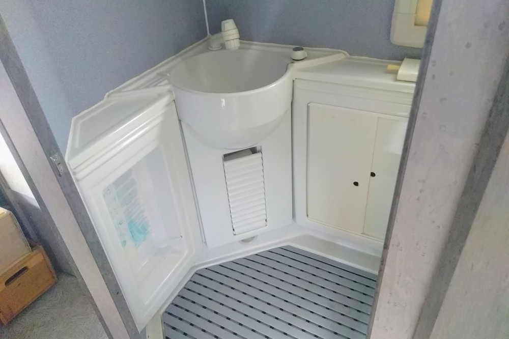 extra opstapplank naar alkoof, pannenset, gevulde besteklade, afvalbakje,