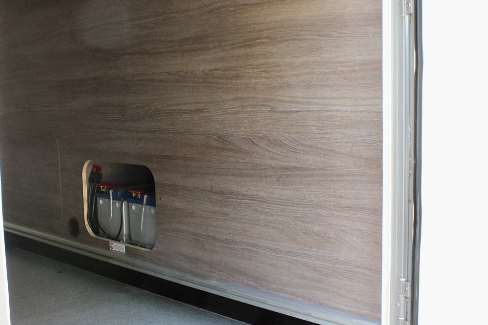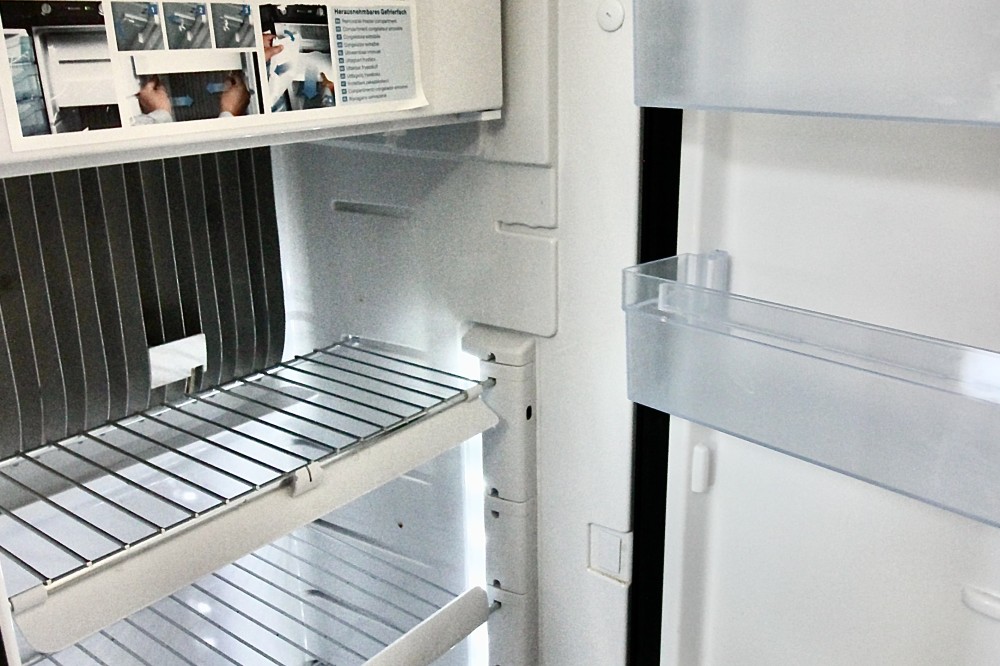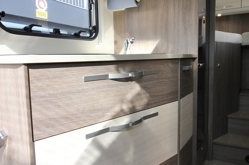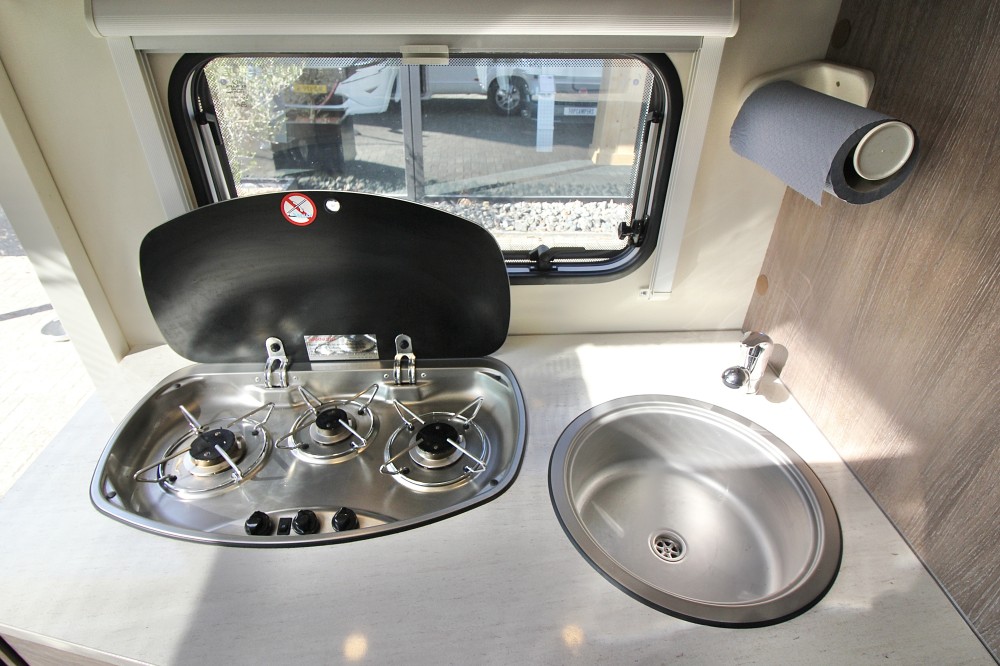 - De keuken is uitgerust met een 3-pits gaskomfoor met vonkontsteking, een RVS spoelbak en een ruime koelkast met vriesvak