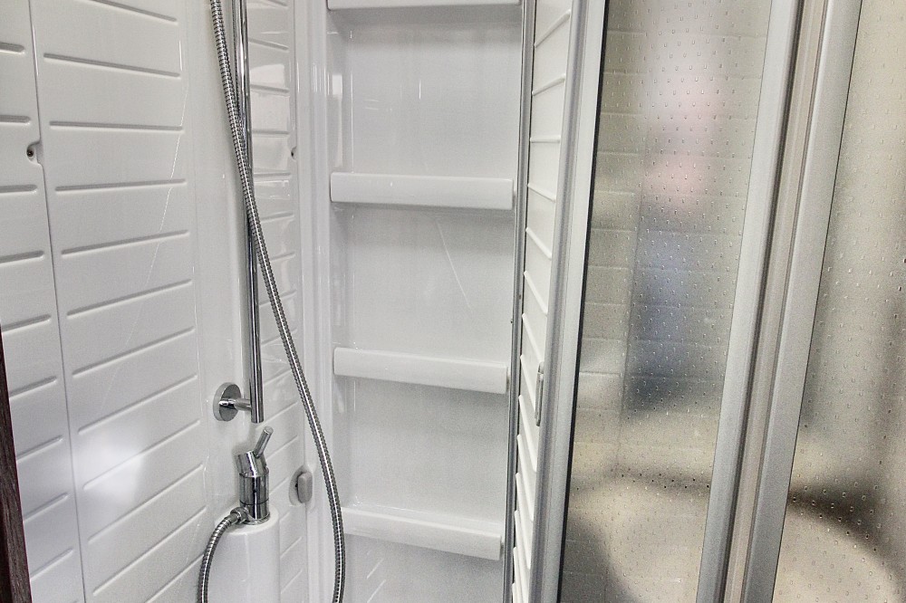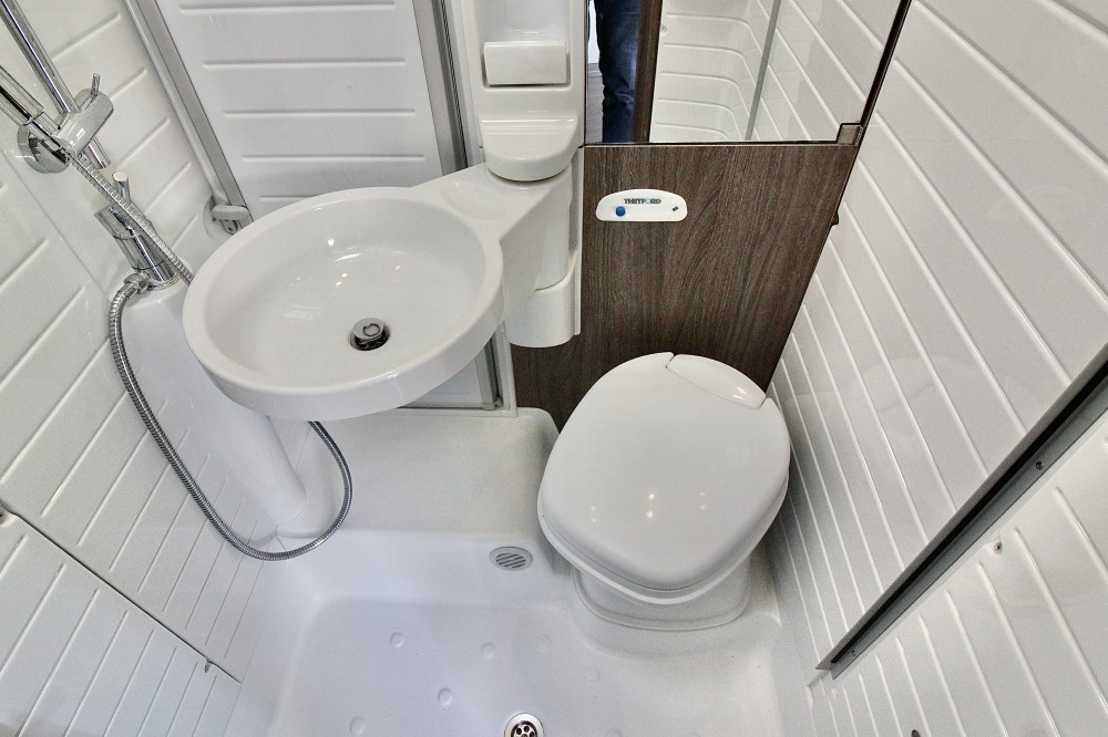 - De badkamer is voorzien van een draaibaar toilet, verplaatsbare wastafel en een ruime afsluitbare douche