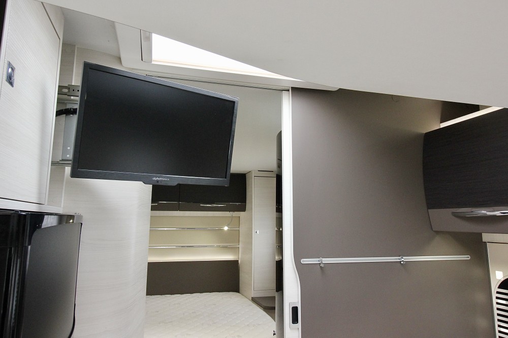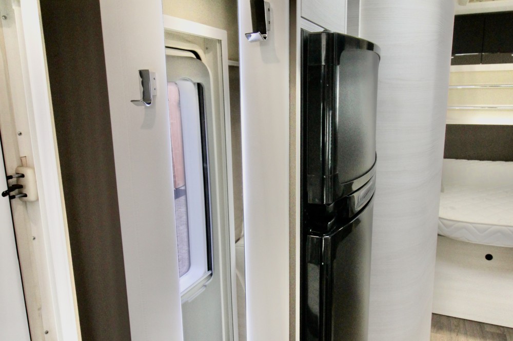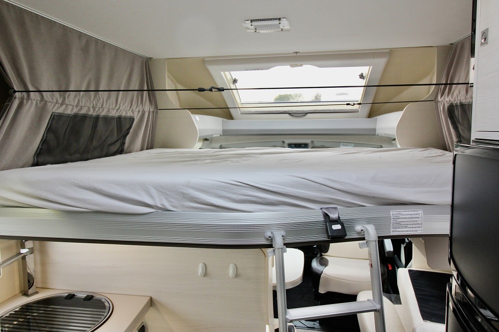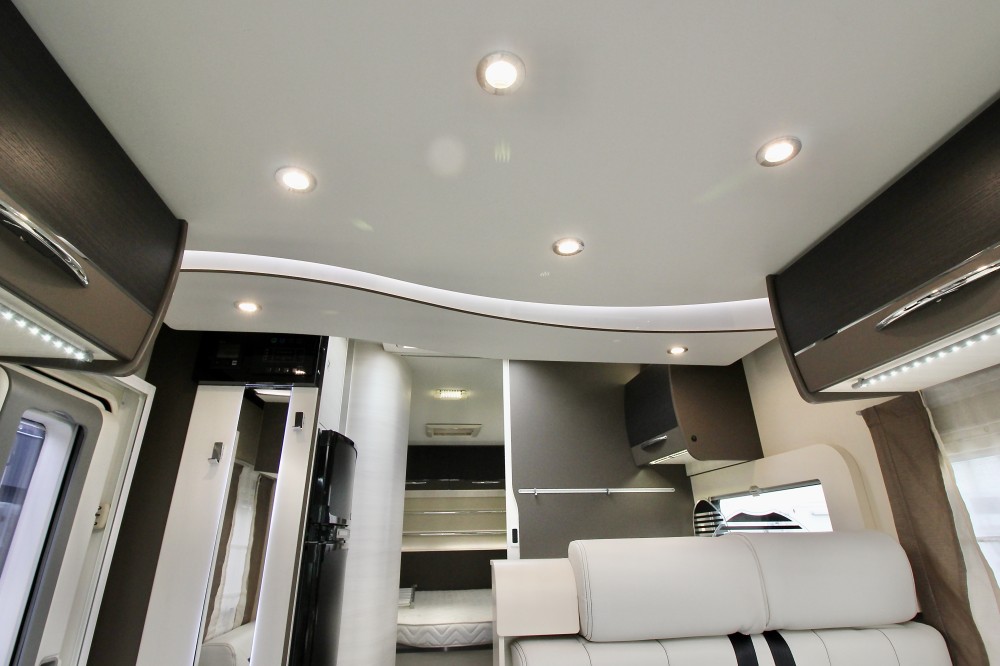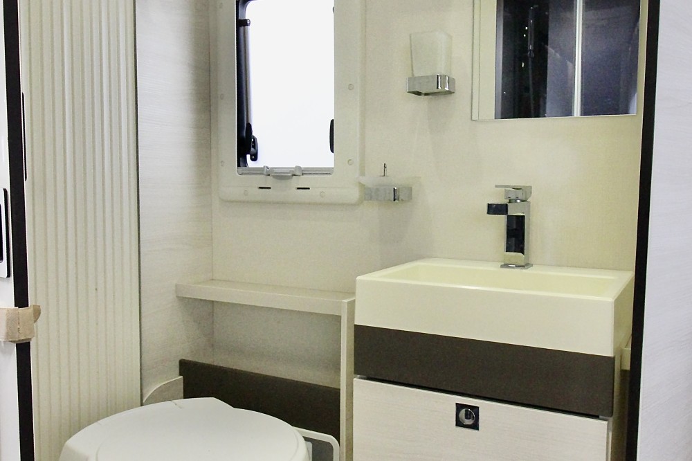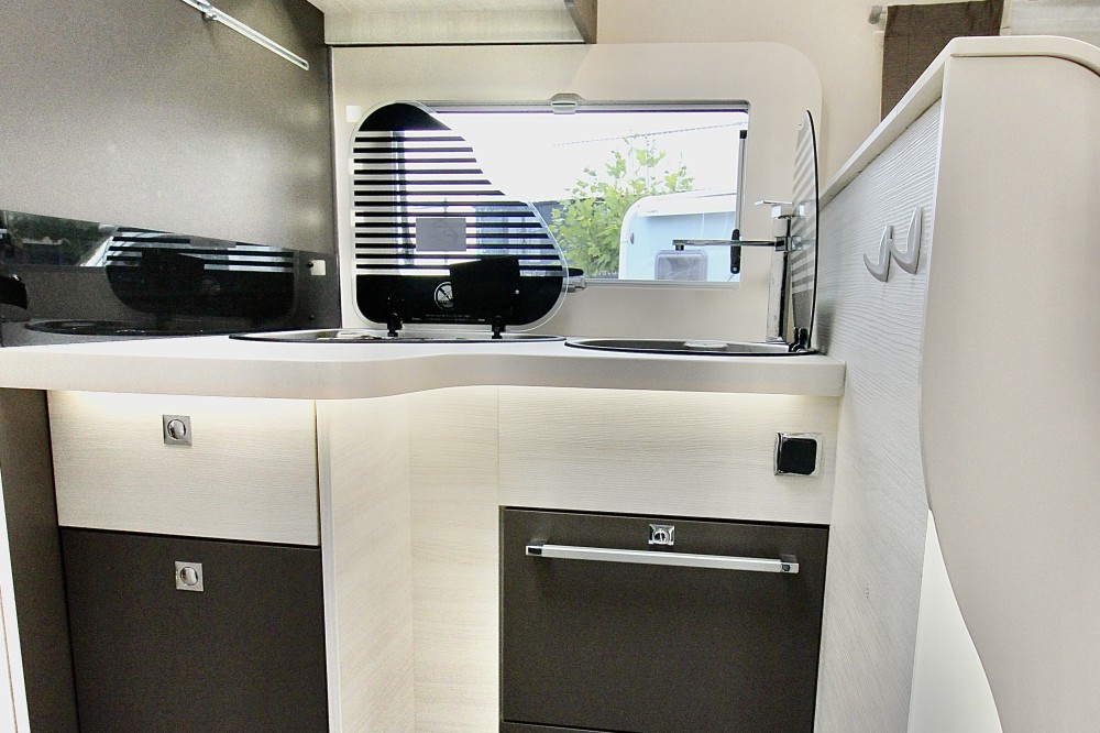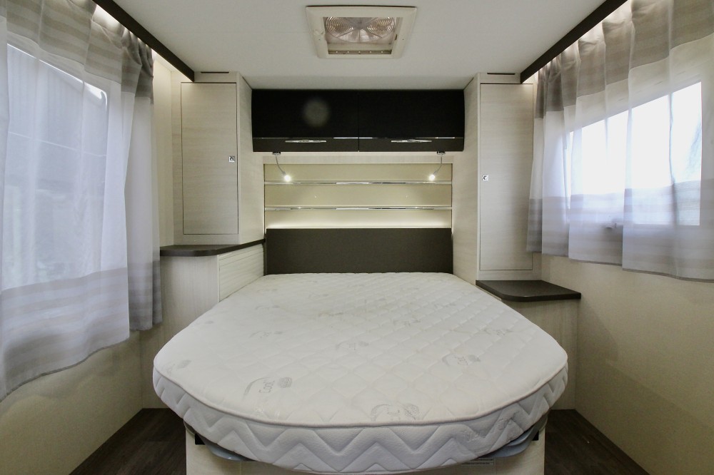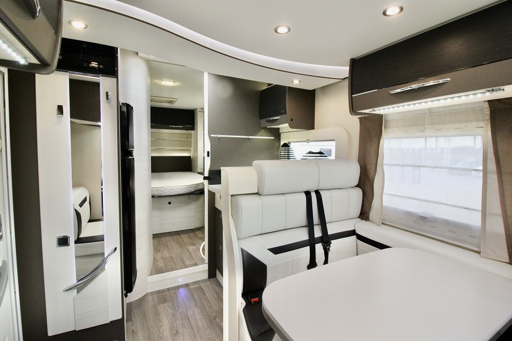 Indeling:Achterin een Queensbed (190×140),een aparte douchecabine, de toiletruimte met een wastafel en een draaibaar toilet, een ruime L-keuken met een 3-pits gaskomfoor, rvs spoelbasin en een Thetford XXL-koelkast met aparte vriezer, een ruime 5-persoons dinette met 2 comfortabele draaistoelen.
