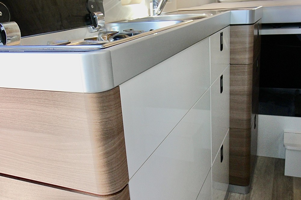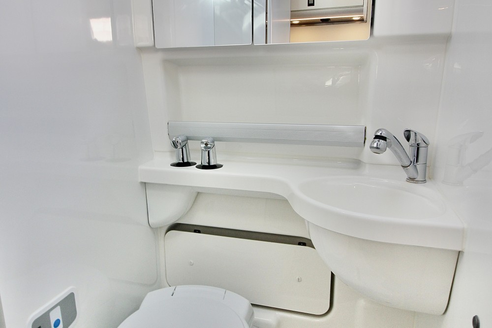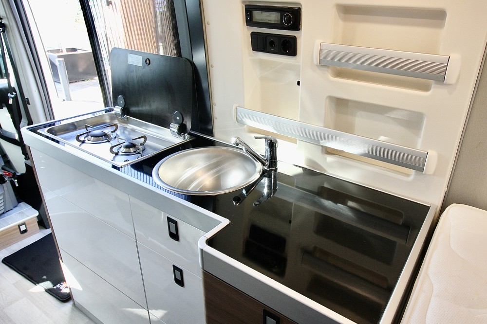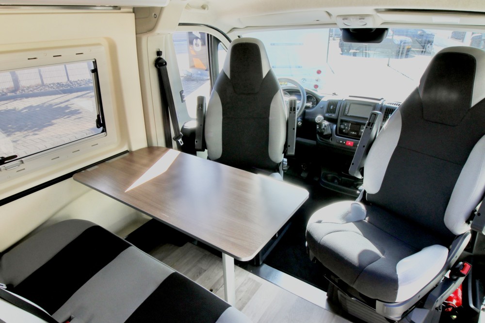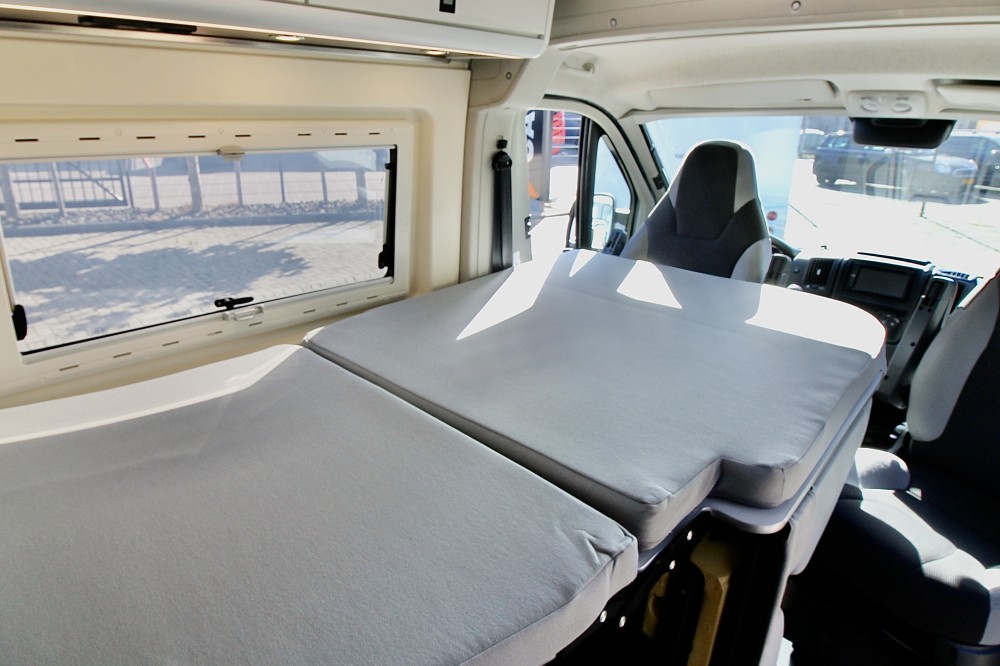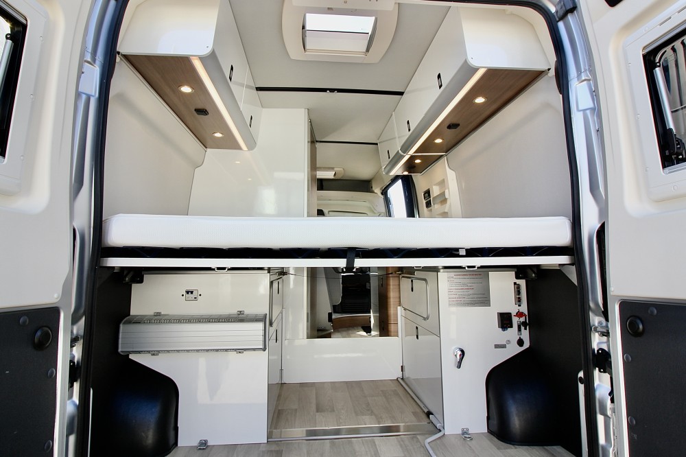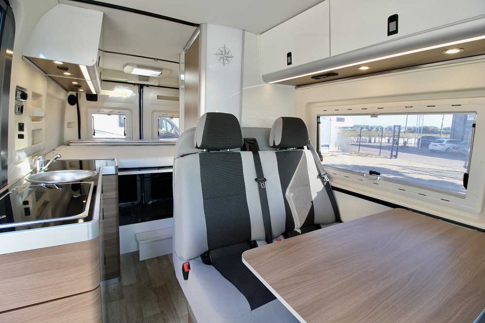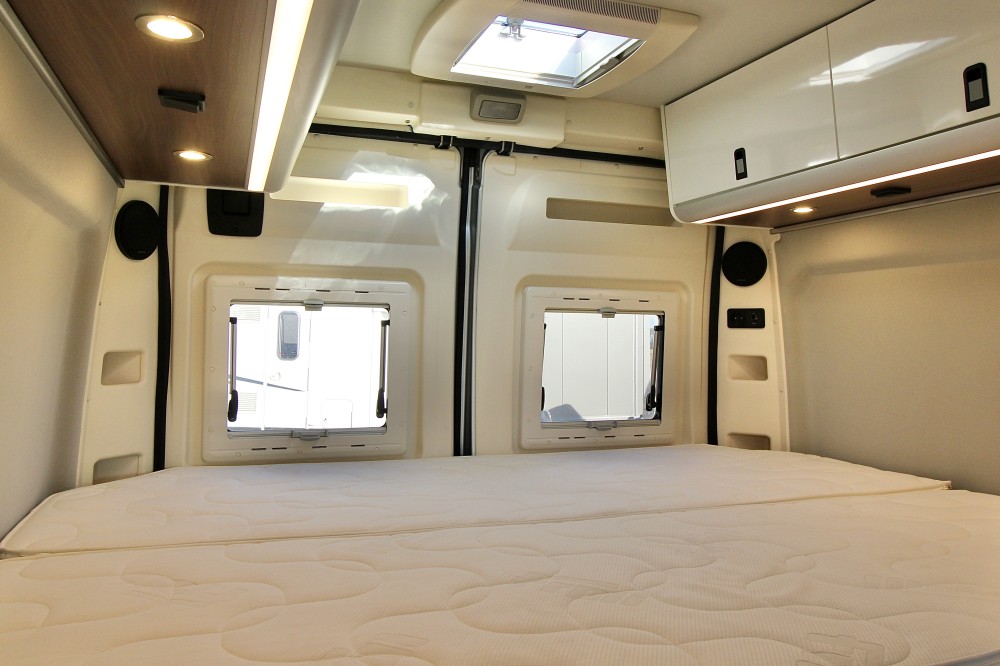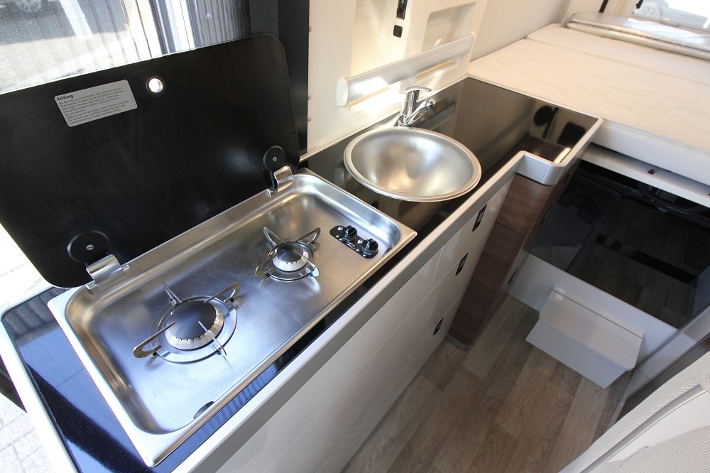 Achterin een vast bed (195×140), de keuken is voorzien van een 2-pits gaskomfoor,RVS spoelunit en een koelkast, de badkamer met een draaibaar toiletwastafel en douche, een ruime 4 -persoons dinette, makkelijk om te te bouwen tot slaapplaats.