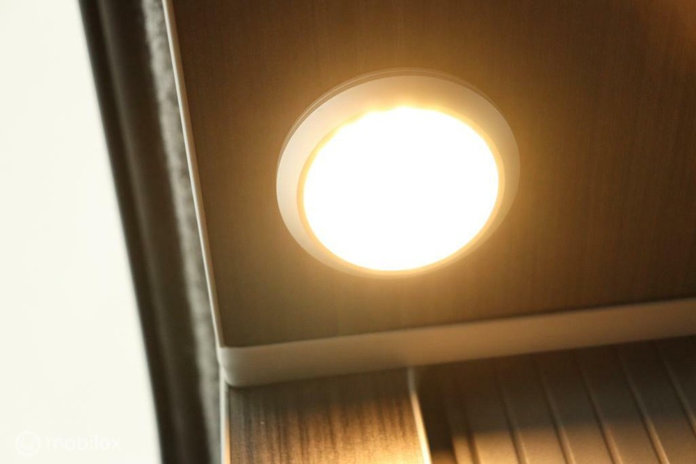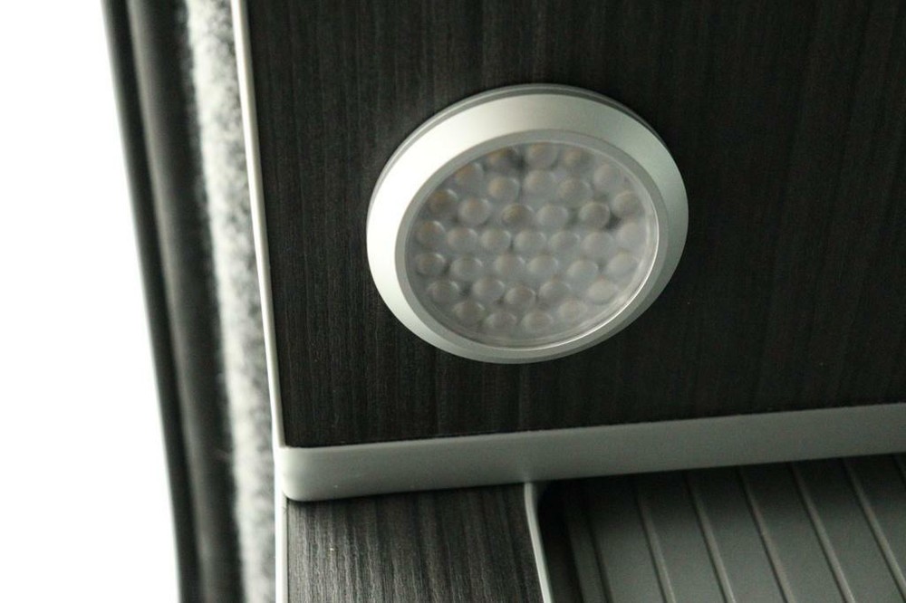 De buscamper is binnen voorzien van led lampjes.