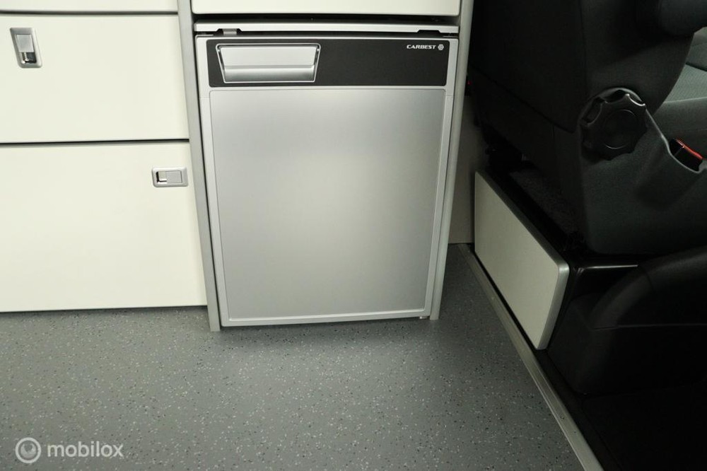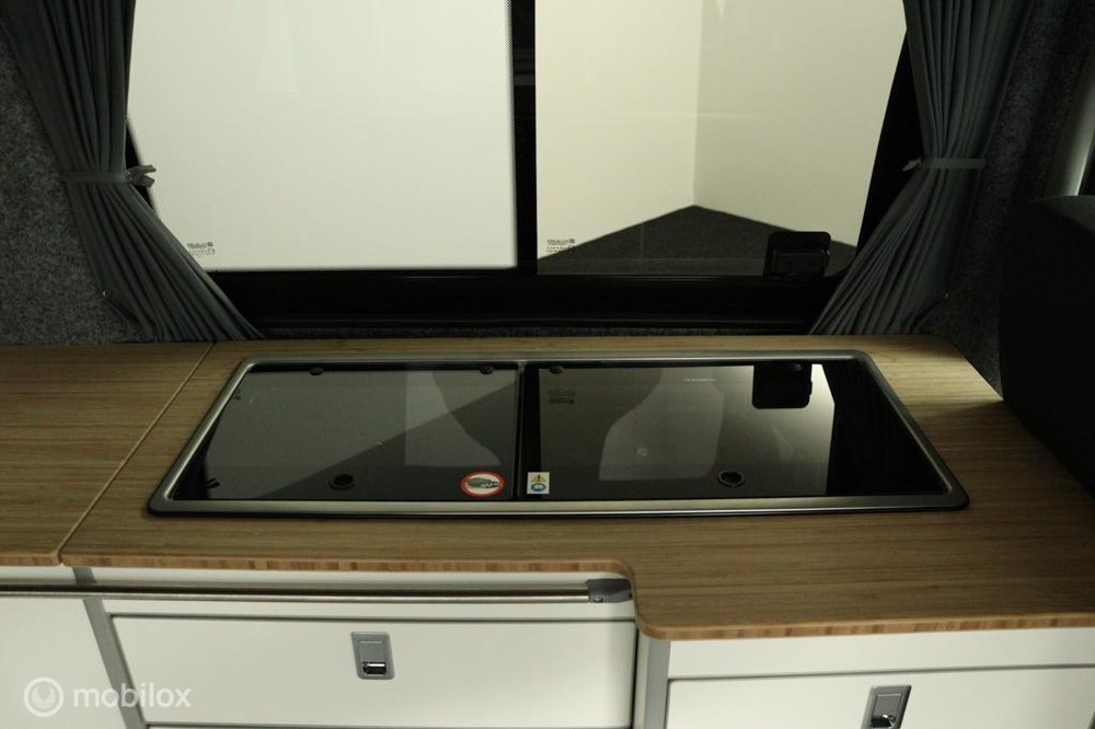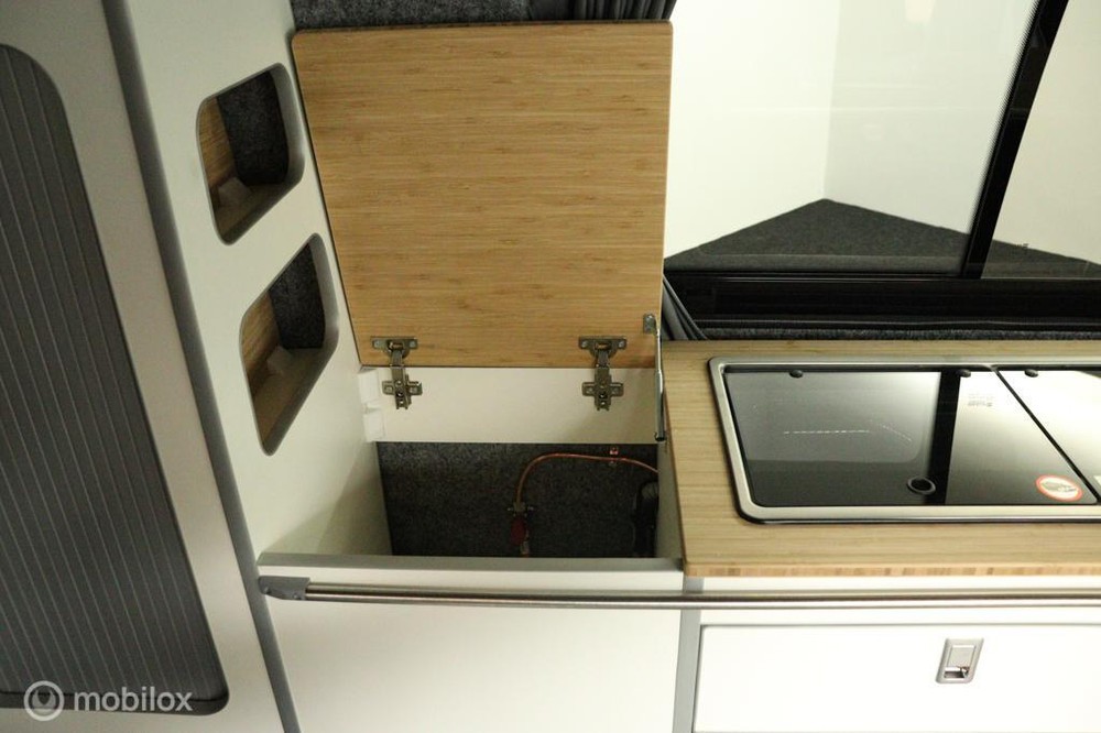 keukenblok bestaat uit een spoelbak met schoon en vuilwater tank en een 2 pits gasstel. Verder een besteklade, dometic compressor koelkast met vriesvakje koelvak heeft een inhoud van 45 liter en verschillende opbergvakjes.