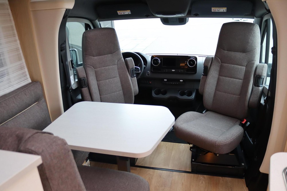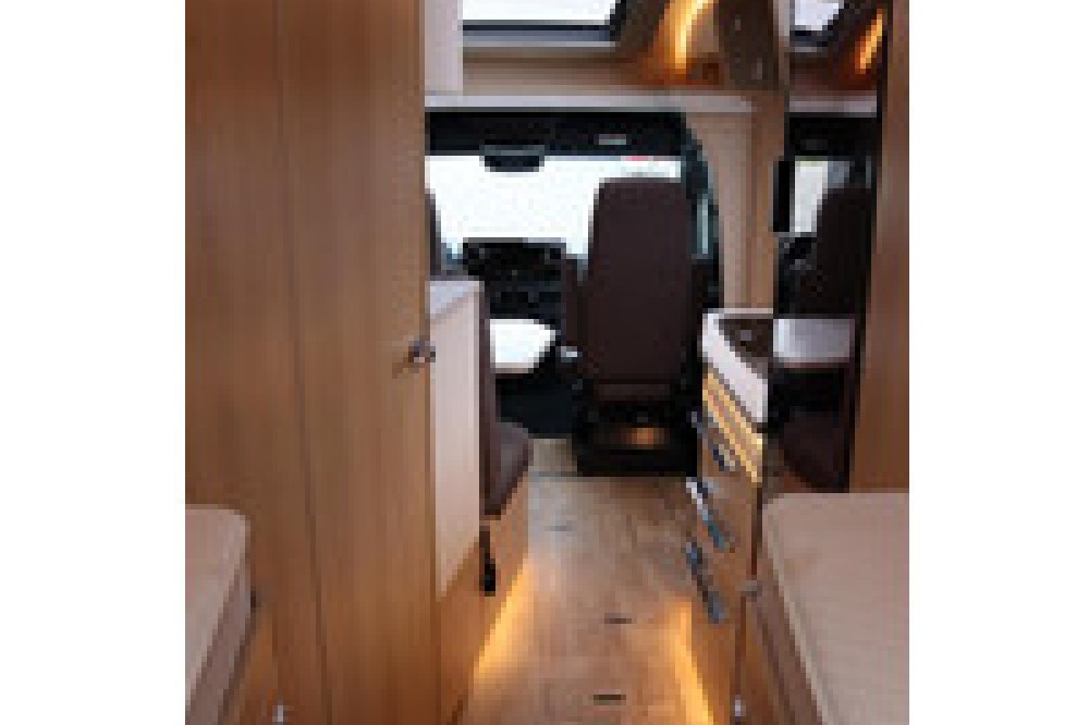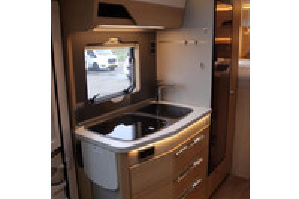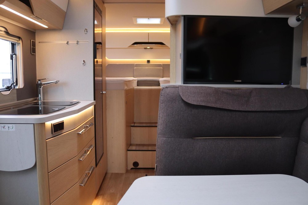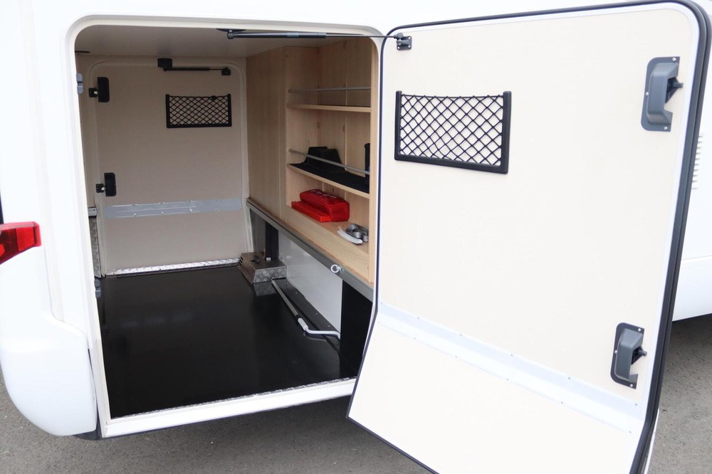 Luxe en praktische detailsDe Hymer BMC-T 580 biedt een ruime zithoek met een L-zit die ontstaat door de luxe draaibare voorstoelen. Het elegante Grand Oak meubeldecor in combinatie met de luxe Janeiro bekleding zorgt voor een verfijnde uitstraling. Dankzij de dubbele bodem, die verwarmd is en extra opbergruimte biedt, kun je jouw spullen veilig en droog opbergen. De 180 liter schoonwatertank en de 150 liter vuilwatertank zijn weggewerkt in de dubbele bodem, terwijl je vanuit de buitenkant eenvoudig toegang hebt tot de opslagruimte. De ruime garage heeft een laadhoogte van 132 cm, is aan beide zijden toegankelijk en biedt voldoende ruimte voor uw fietsen, scooter en bagage.