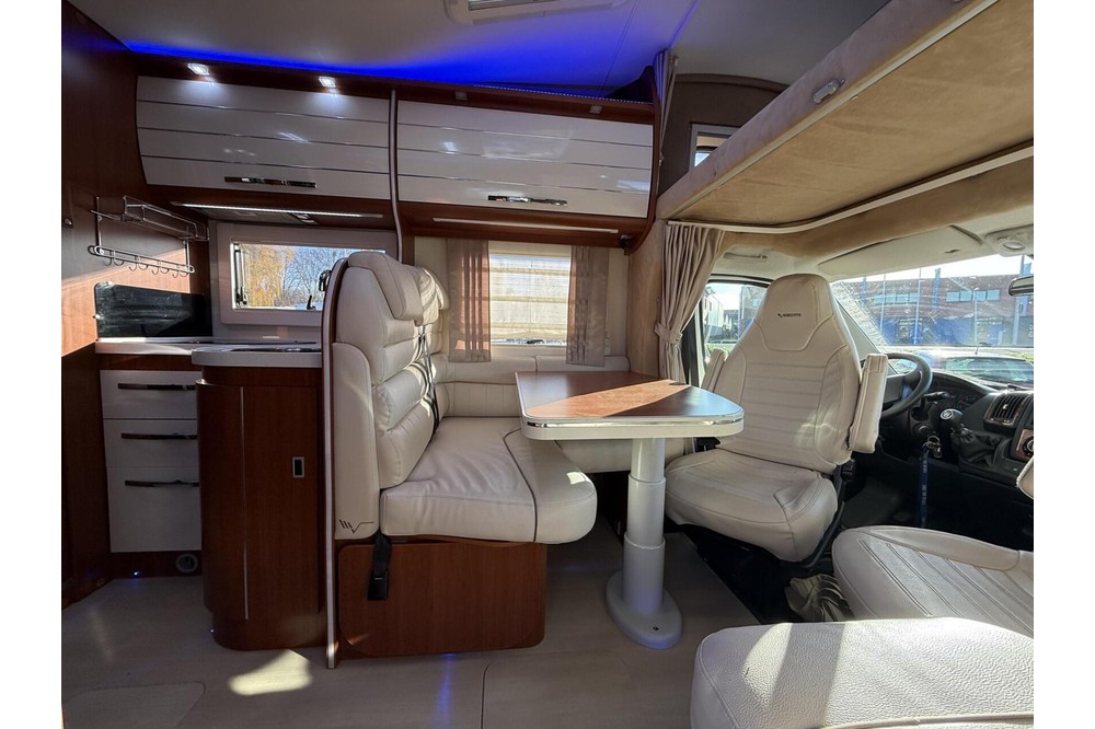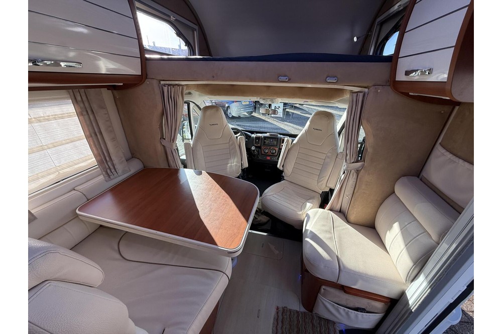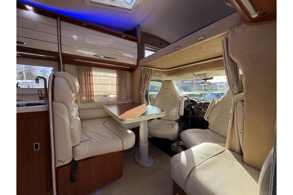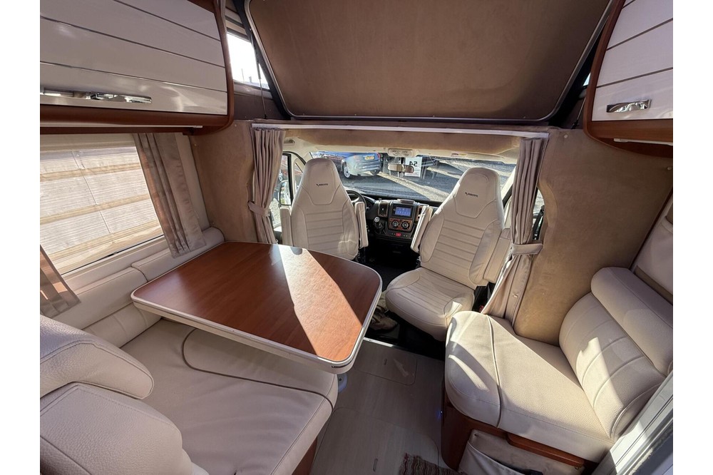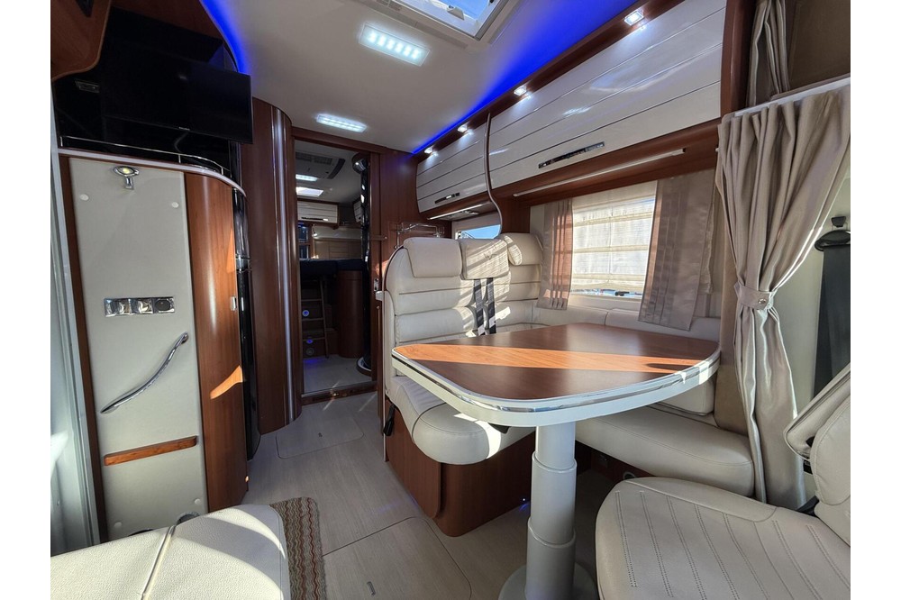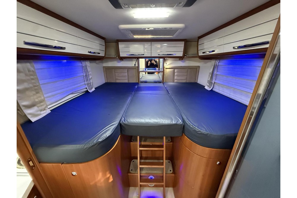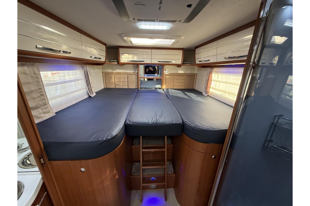 Eethoek voorin met draaibare stoelen en zitplaatsen aan de zijkant; keuken met koelkast van 150 liter; aparte woon-/slaapruimte; badkamer met aparte douche; twee eenpersoonsbedden achterin; grote garage; tweepersoonsbed in de alkoof