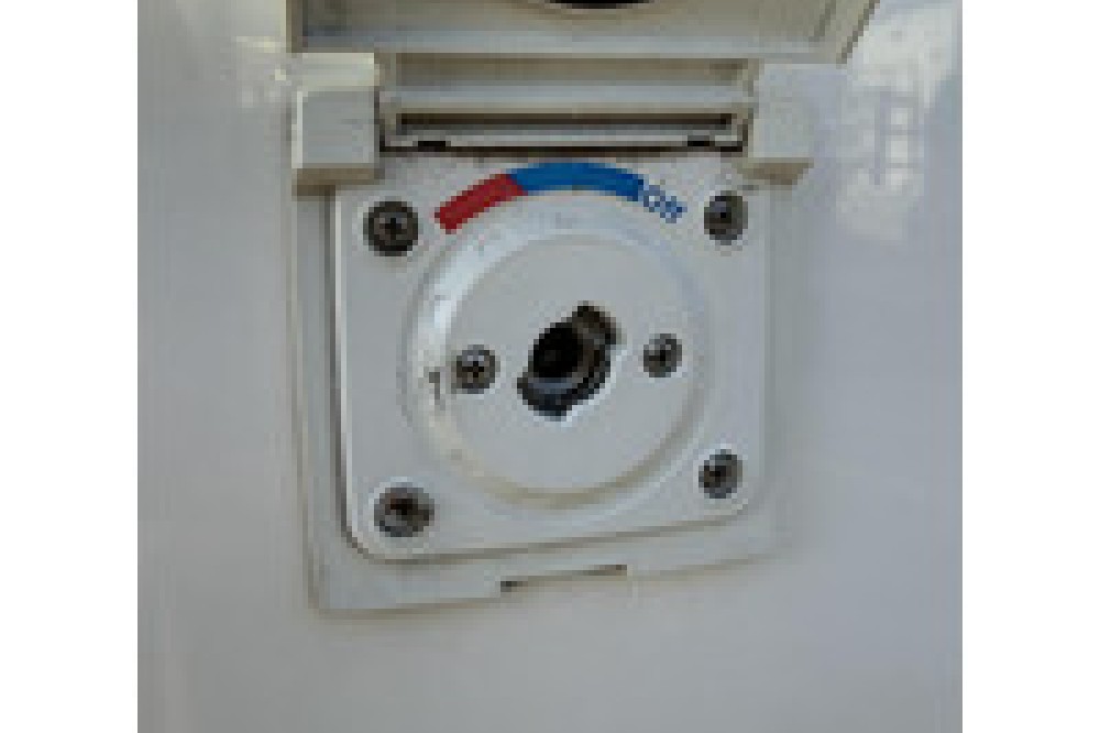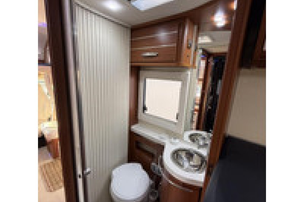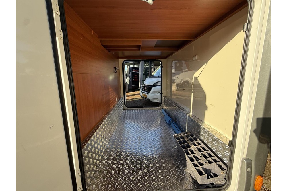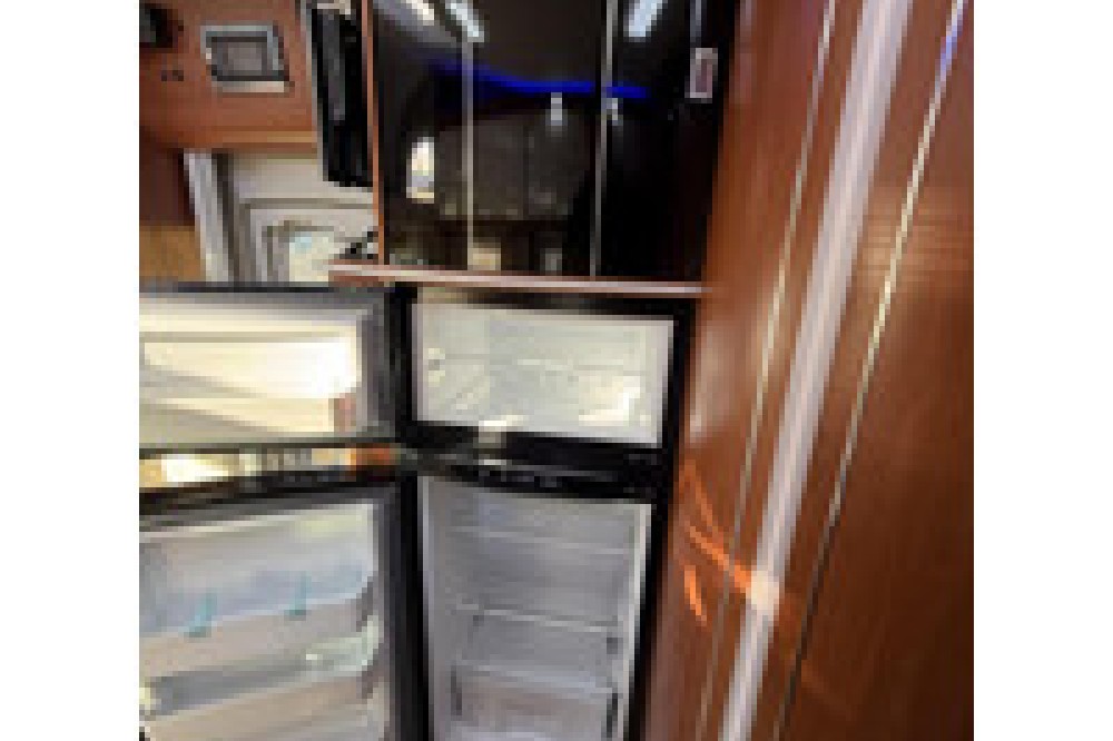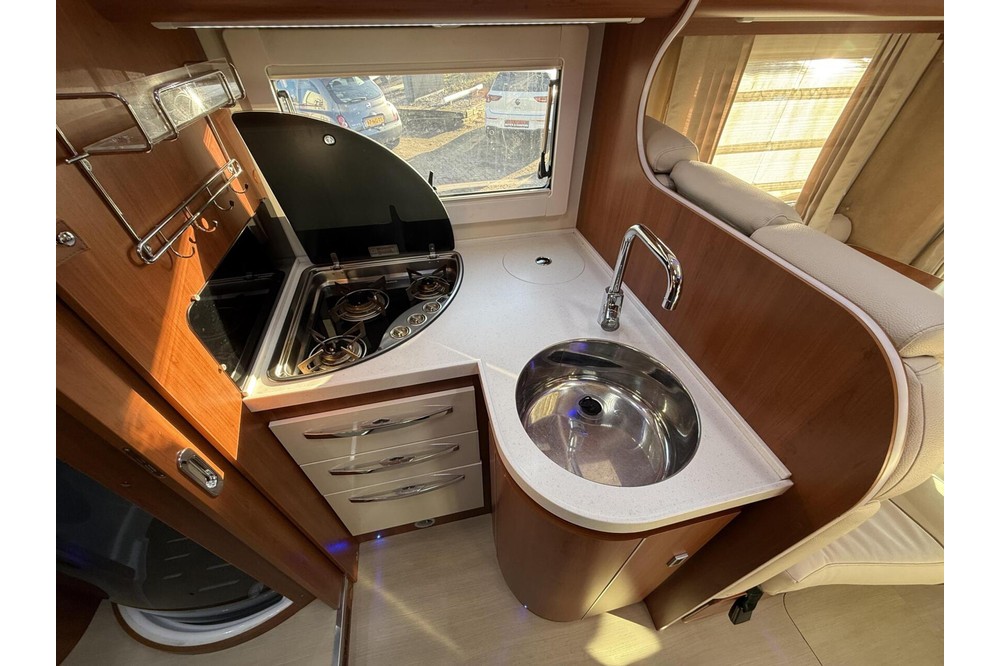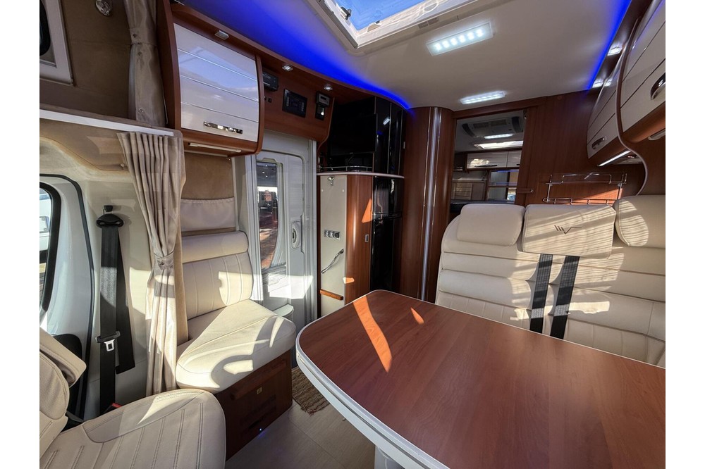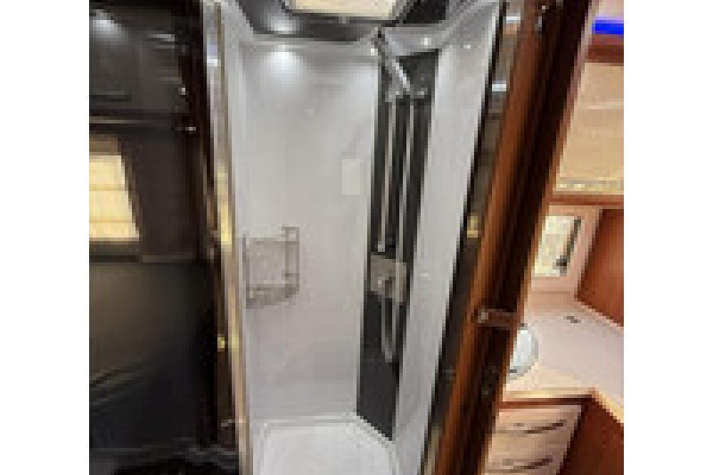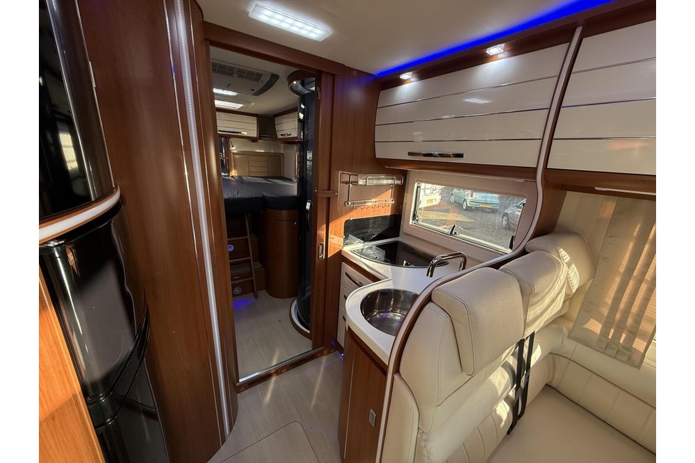 Eethoek voorin met draaibare stoelen en zitplaatsen aan de zijkant; keuken met koelkast van 150 liter; aparte woon-/slaapruimte; badkamer met aparte douche; twee eenpersoonsbedden achterin; grote garage; tweepersoonsbed in de alkoof