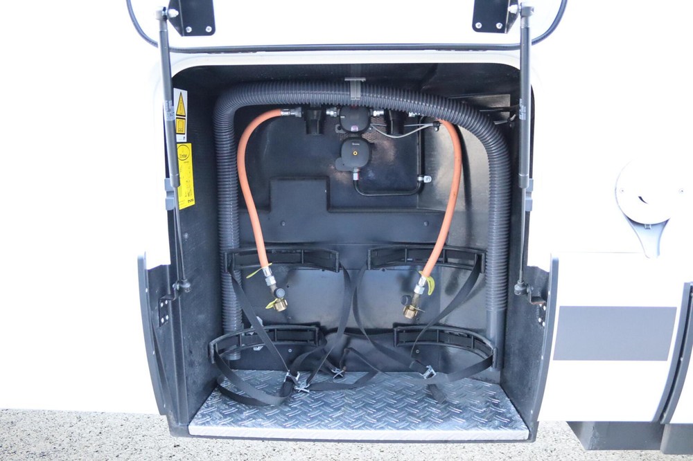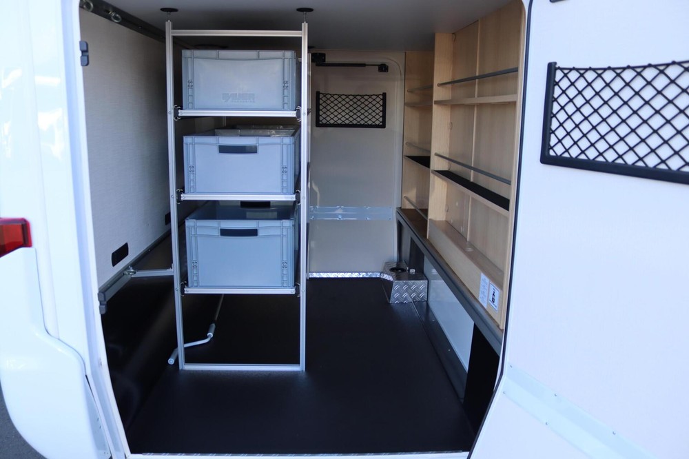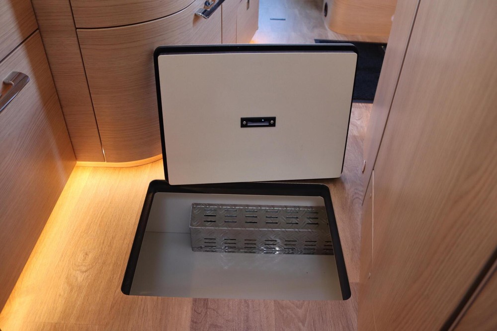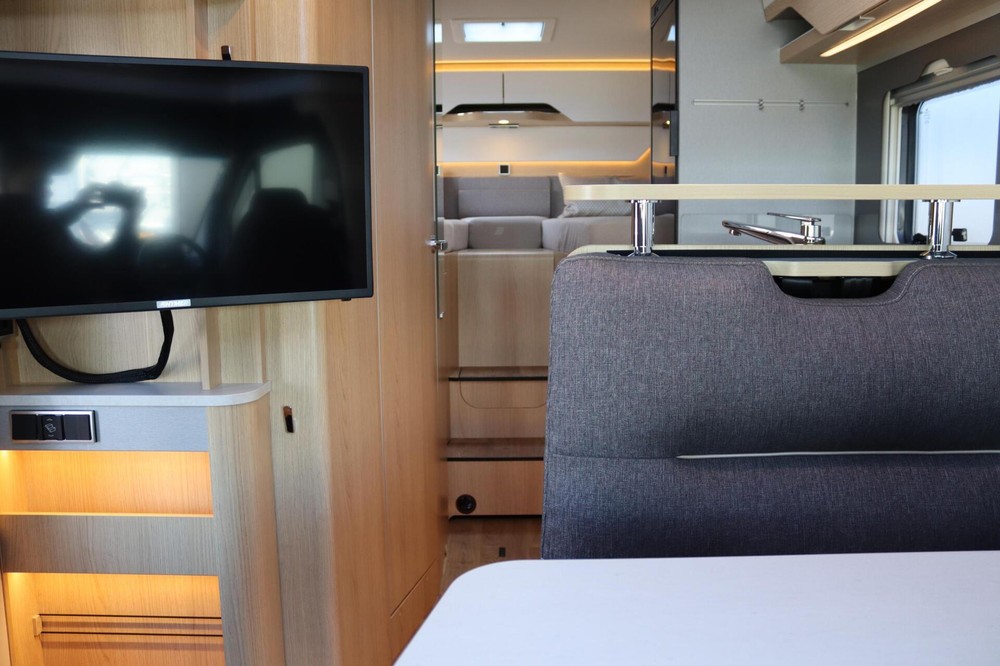Luxe en praktische detailsDe Hymer BMC-T 600 biedt een ruime zithoek met een L-zit die ontstaat door de draaibare voorstoelen. Het elegante Grand Oak meubeldecor in combinatie met de luxe Janeiro bekleding zorgt voor een verfijnde uitstraling. Dankzij de dubbele bodem, die verwarmd is en extra opbergruimte biedt, kun je jouw spullen veilig en droog opbergen. De 180 liter schoonwatertank en de 150 liter vuilwatertank zijn weggewerkt in de dubbele bodem, terwijl je vanuit de buitenkant eenvoudig toegang hebt tot de opslagruimte. De ruime garage heeft een laadhoogte van 132 cm, is aan beide zijden toegankelijk en biedt voldoende ruimte voor uw fietsen, scooter en bagage.